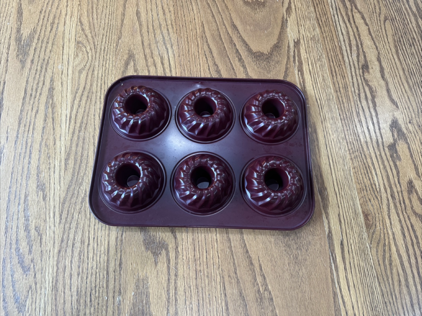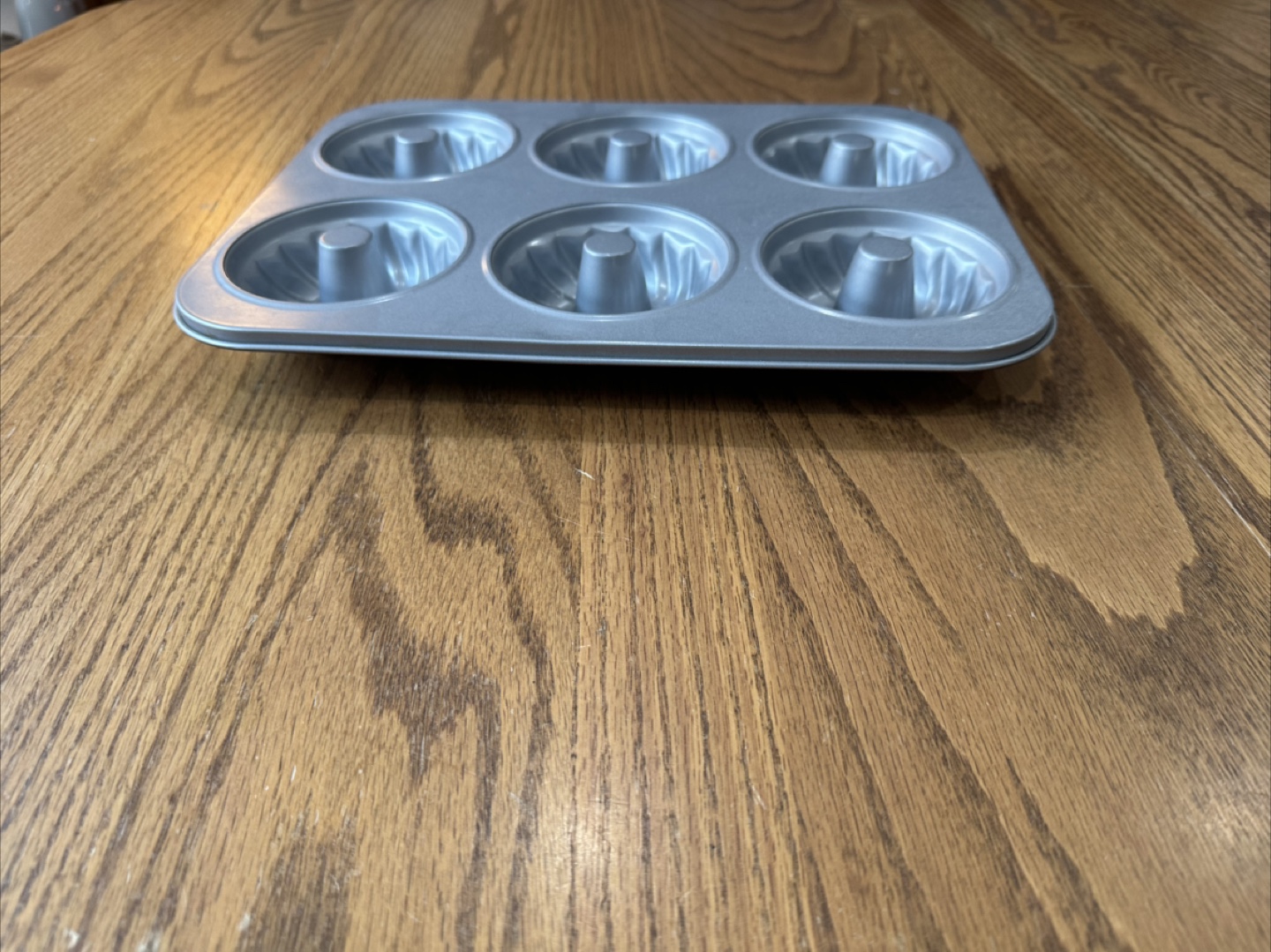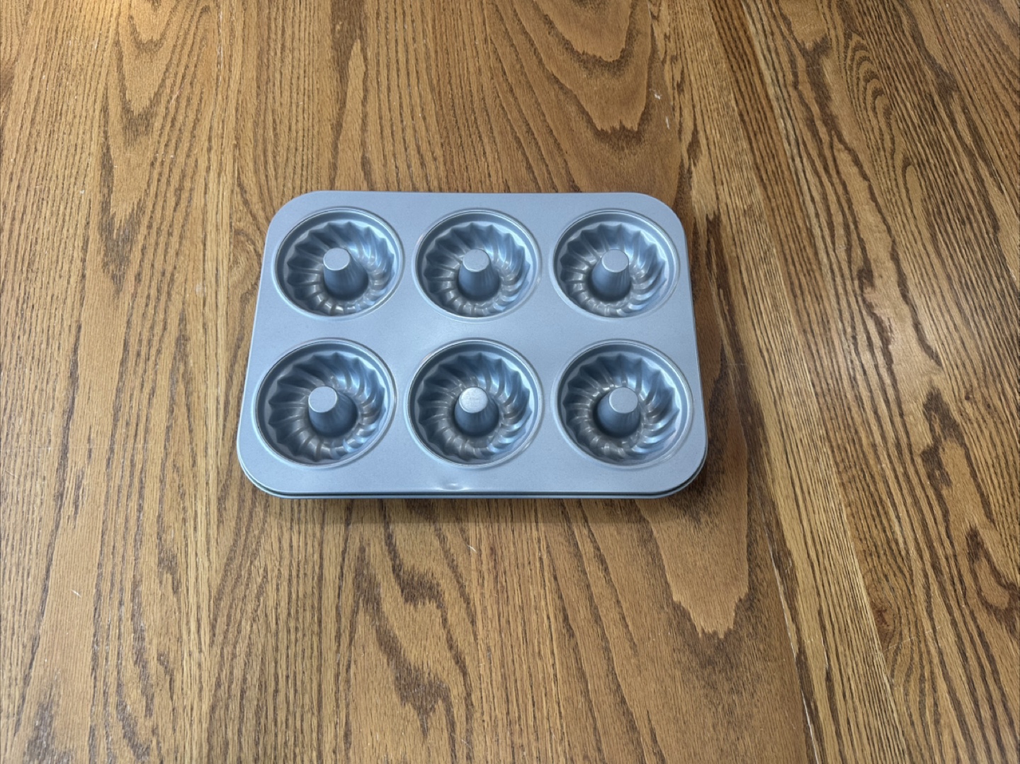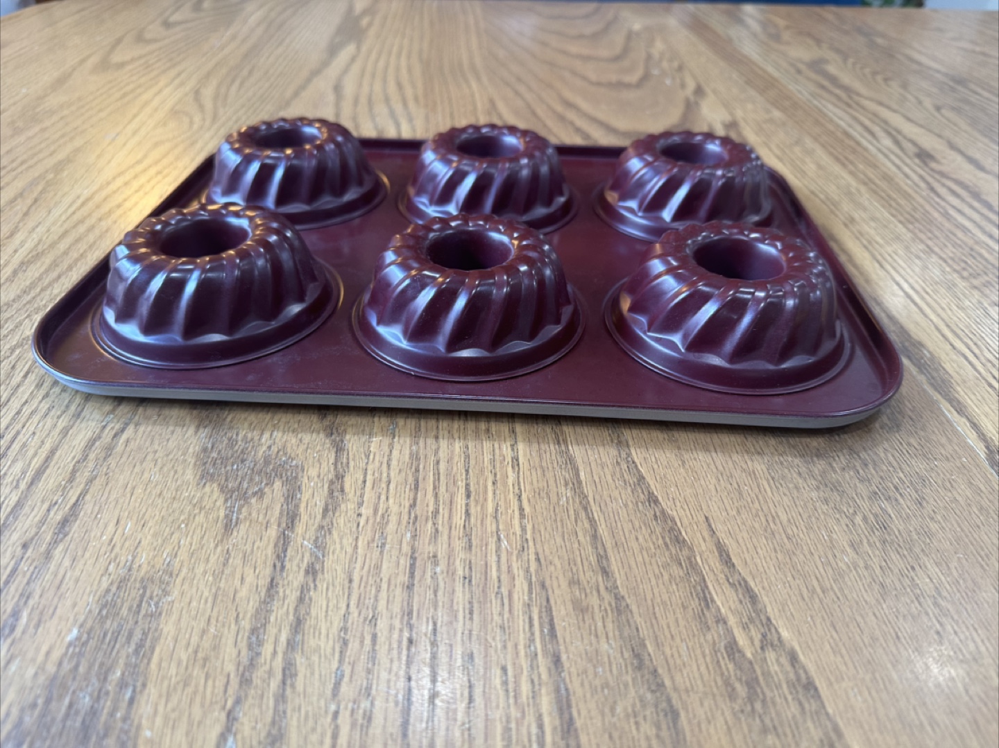Here's a mini bundt cake pan with 6 cavities! Perfect for baking individual bundt cakes or muffins. It's in great condition and ready for your next baking project