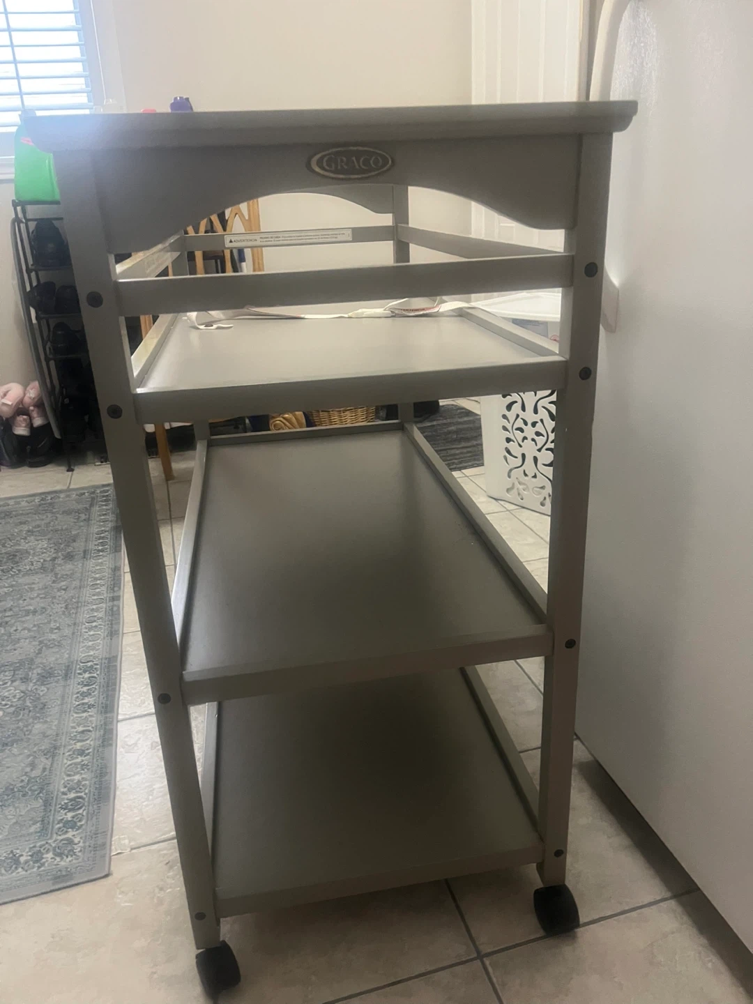 Selling a changing table by Graco! It’s in great condition and ready for a new home. It has three shelves for storage and wheels to move it around easily