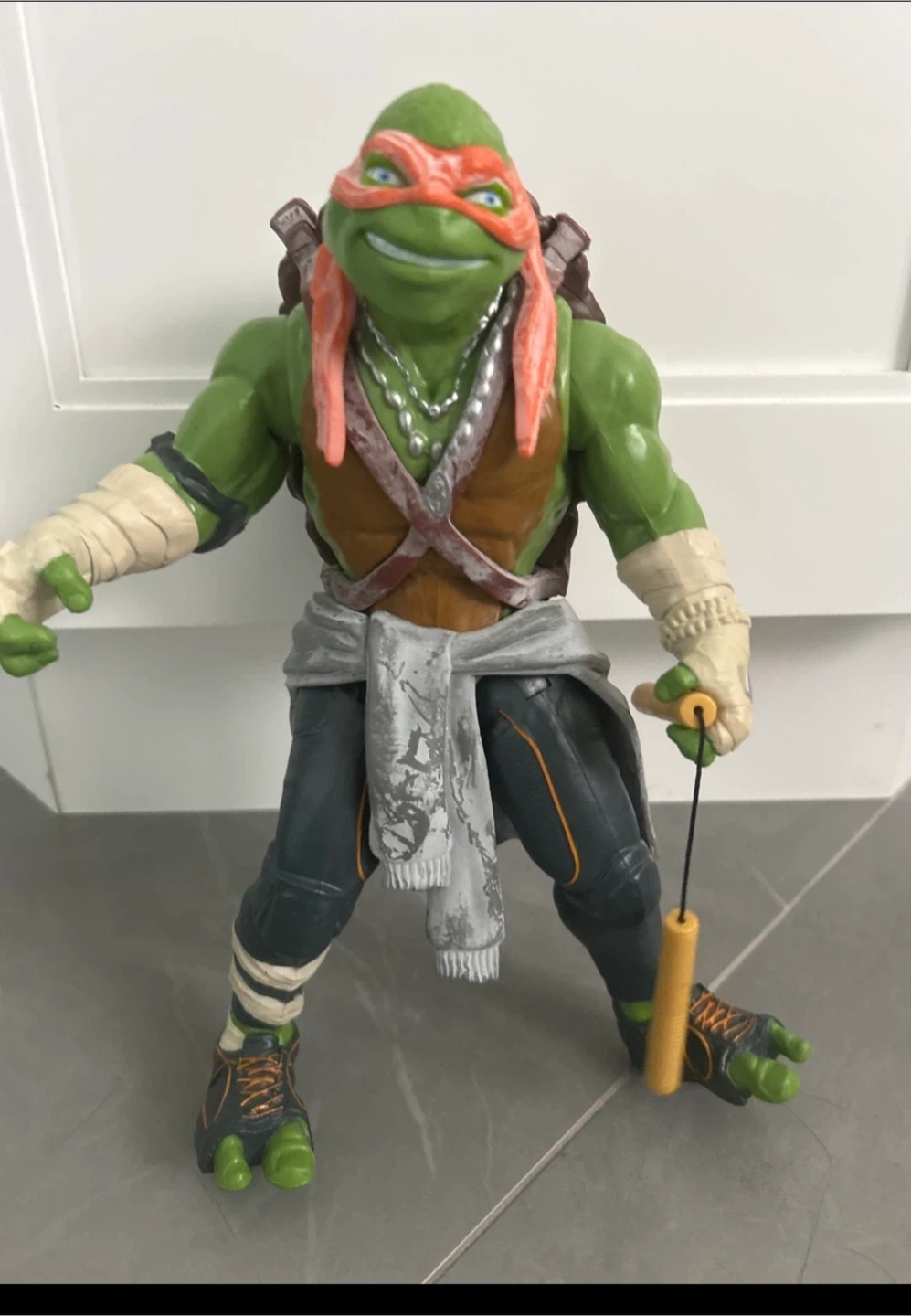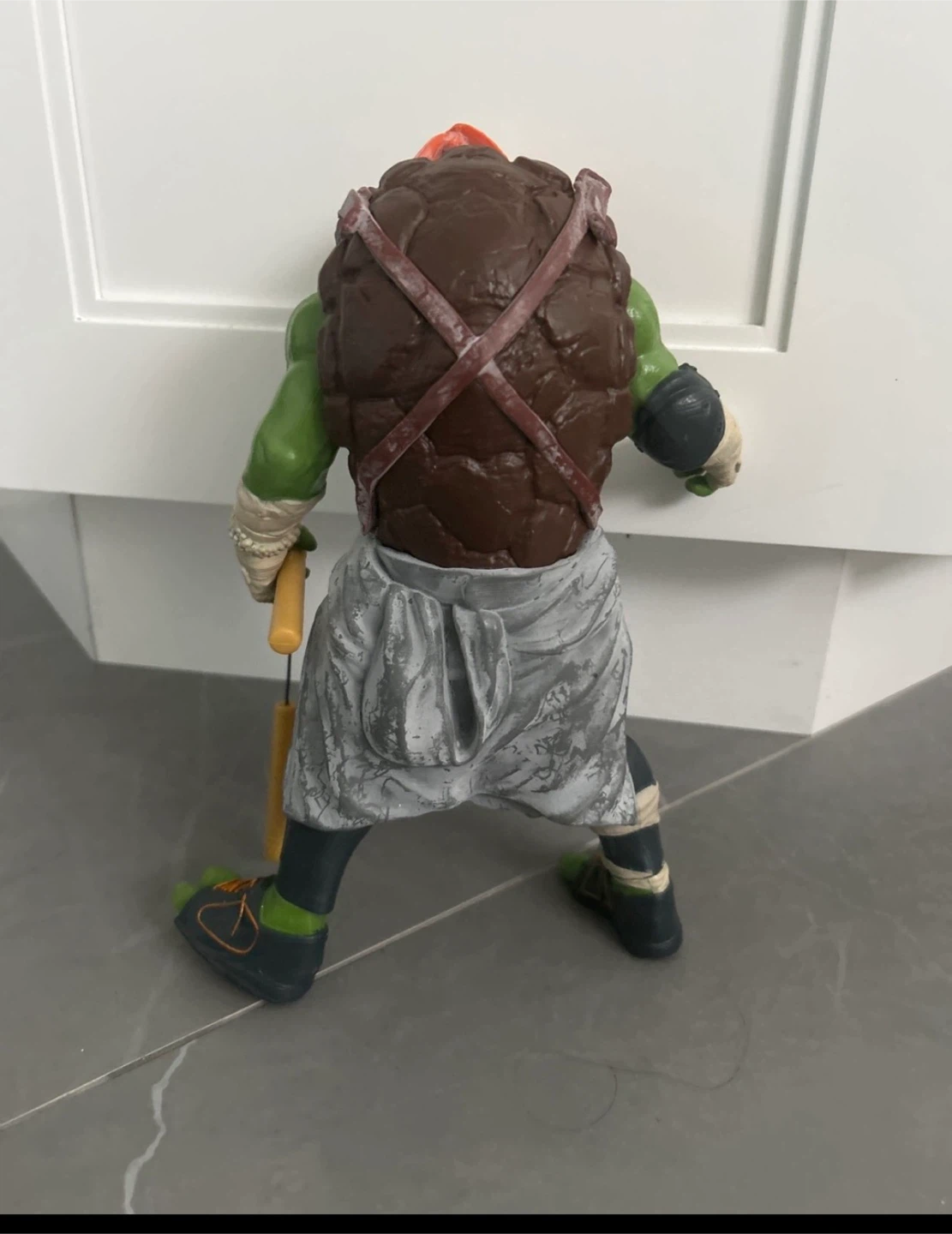 Selling a Teenage Mutant Ninja Turtle action figure. It features a green turtle with an orange mask and a brown shell. It's in great shape and ready for a new home!
