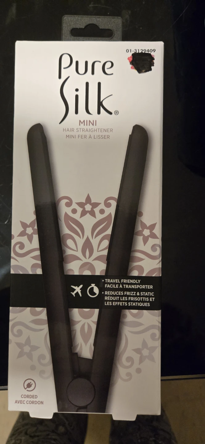Selling a brand new Pure Silk Mini Hair Straightener! It's still in its original packaging. This mini hair straightener is travel-friendly and helps reduce frizz and static. It also features tourmaline coated plates and heats up quickly!
