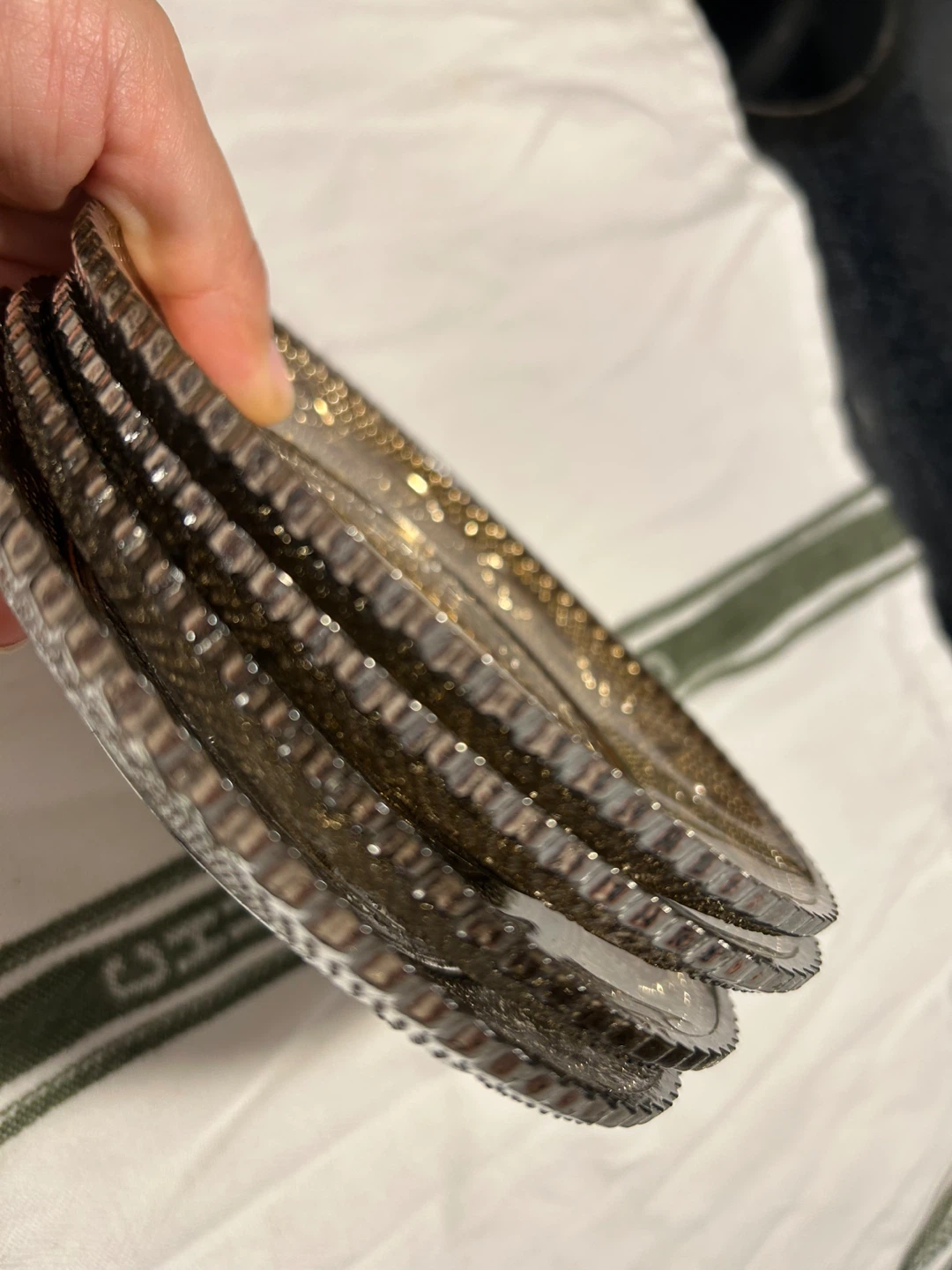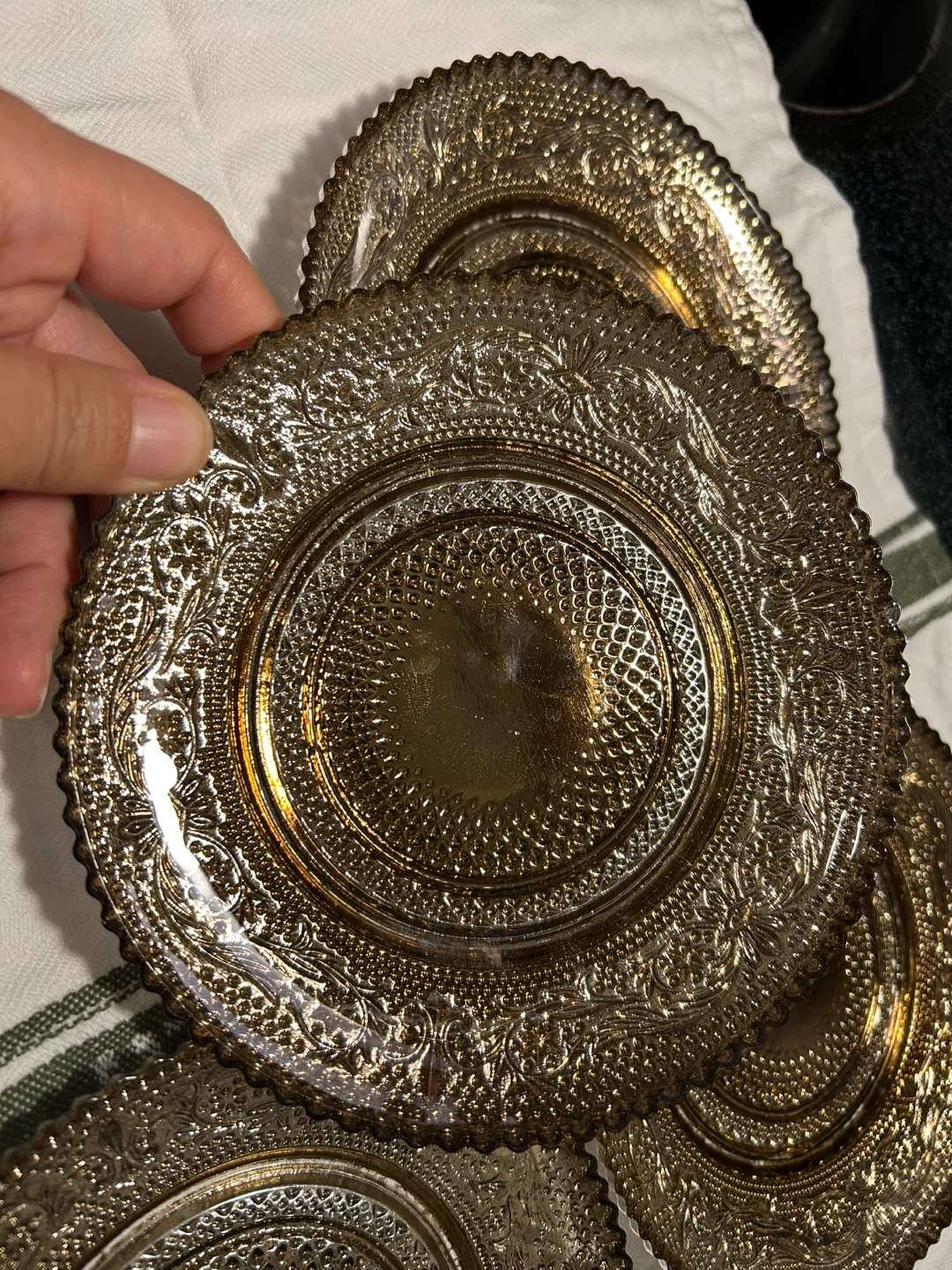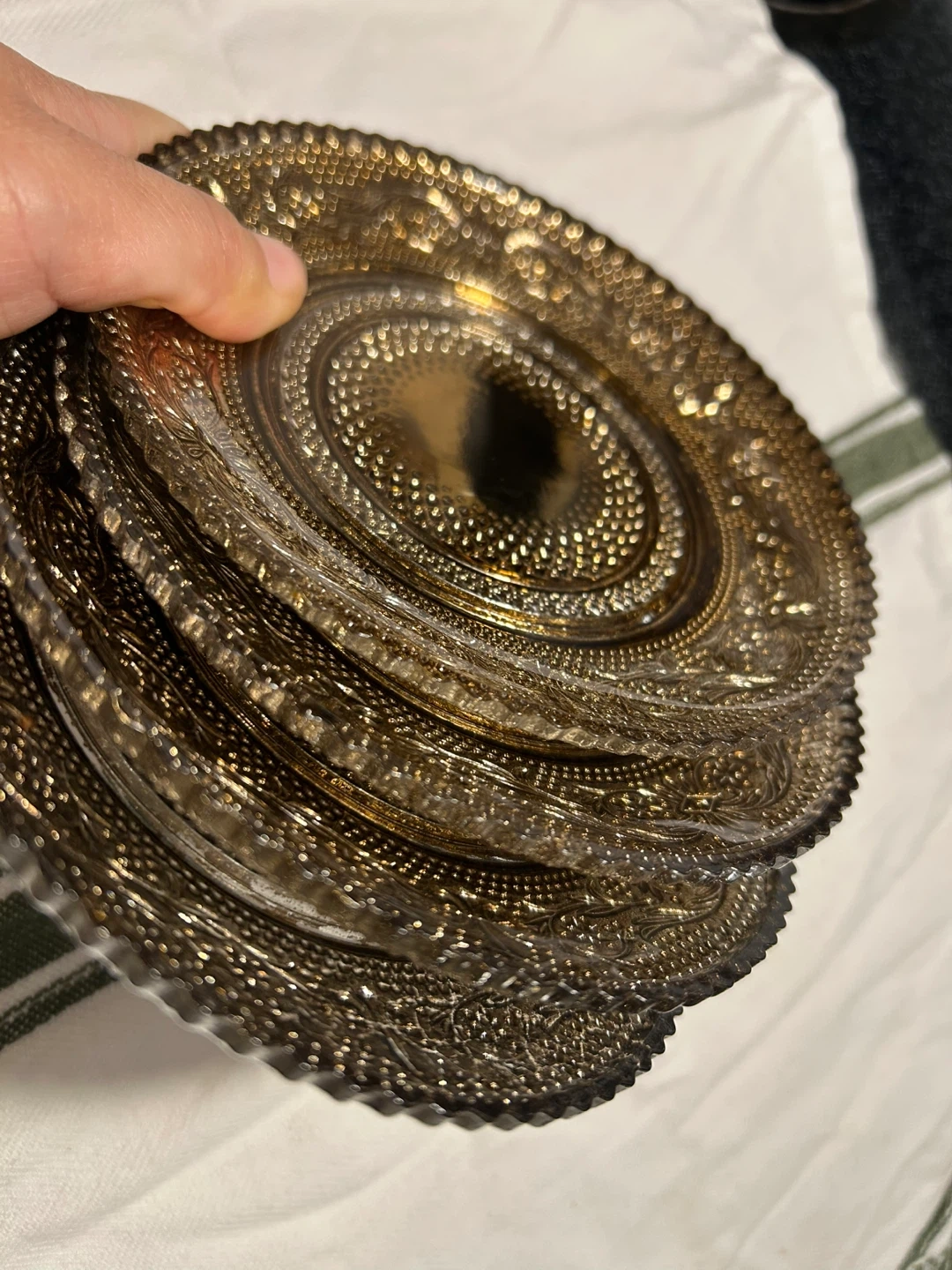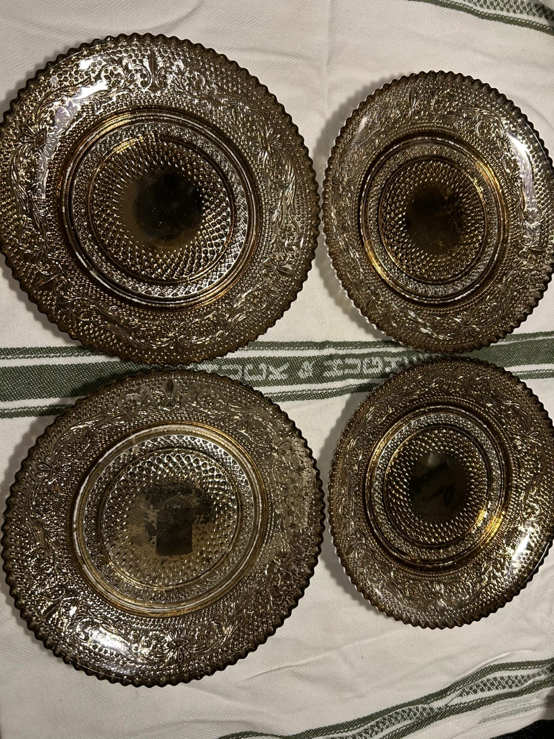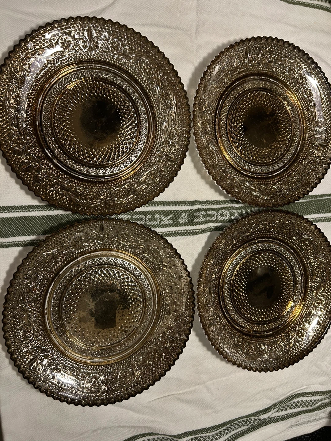 Selling a set of four vintage glass plates. They have a beautiful, intricate design and a lovely brown colour. Perfect for adding a touch of elegance to your table setting!