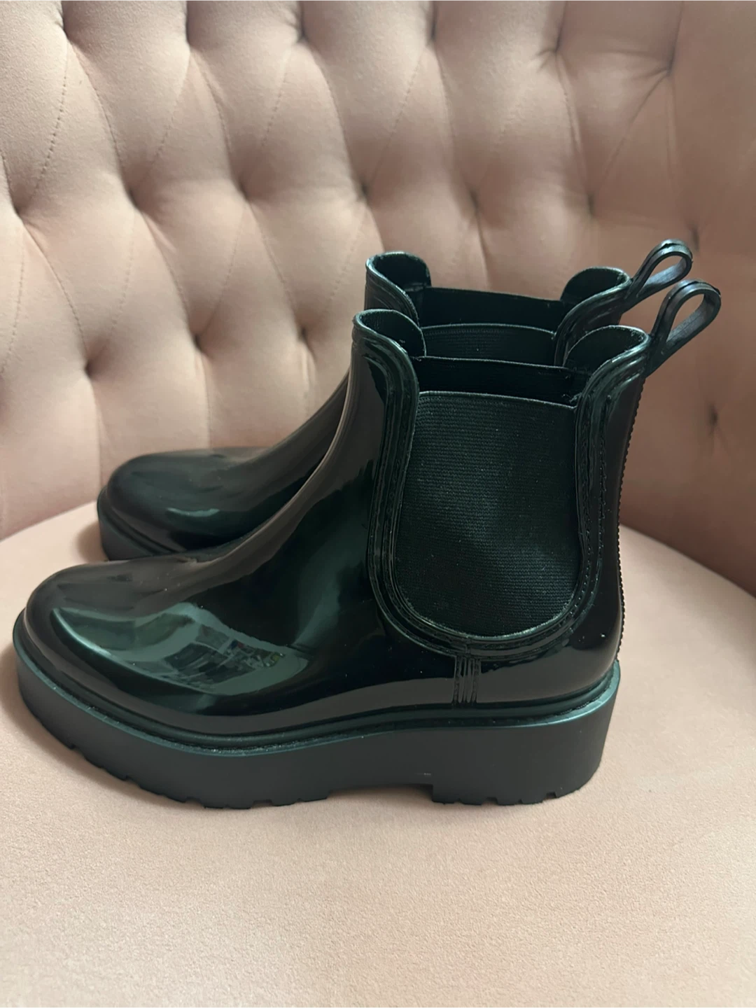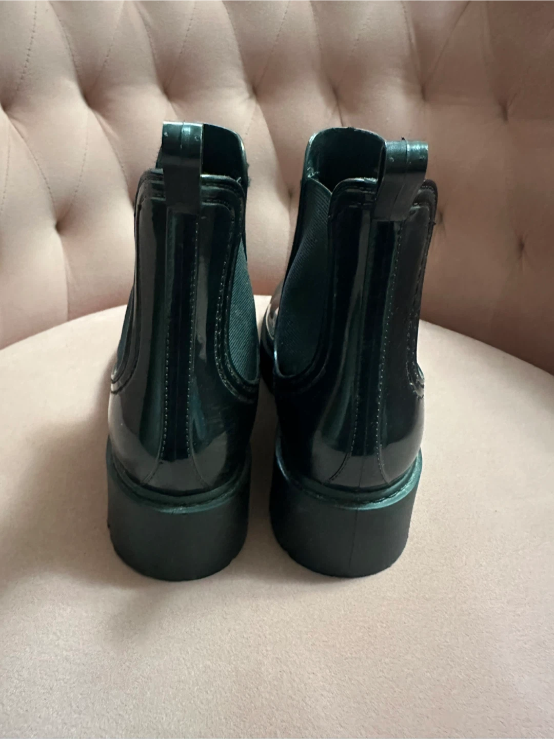 Selling a pair of Steve Madden rain boots in black. They're in great condition and are a size 9. Perfect for rainy days!