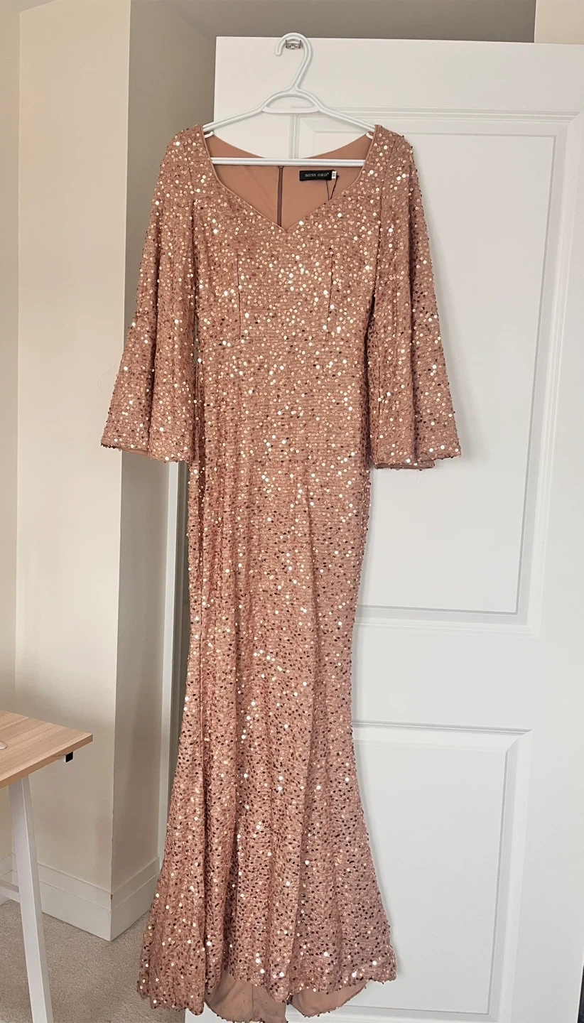 Stunning rose gold Missord sequin dress featuring a sweetheart neckline, trumpet sleeves, and a flattering mermaid hem. Very sparkly and eye-catching, perfect for prom, formal events, parties, or special occasions 💃