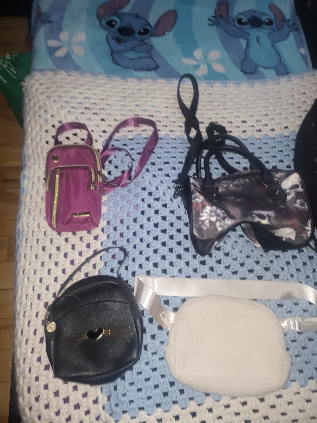 Selling a collection of small bags! There's a purple crossbody, a black cat-shaped bag, a white fuzzy belt bag, and another black bag with a unique print. Great for adding some fun to your outfits!