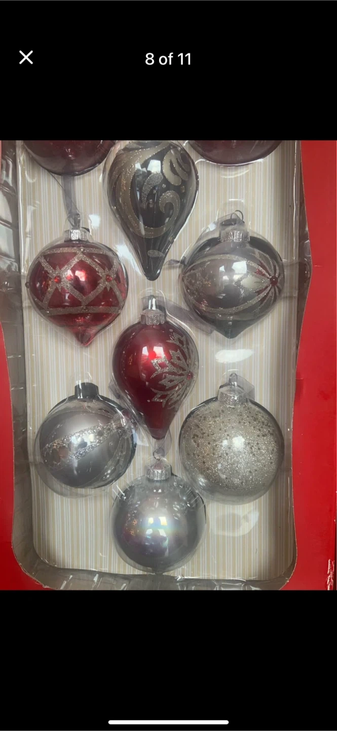 Selling two sets of Christmas ornaments in red and silver colours! Each set comes in its original box and contains 12 ornaments. They're perfect for adding a festive touch to your Christmas tree this holiday season