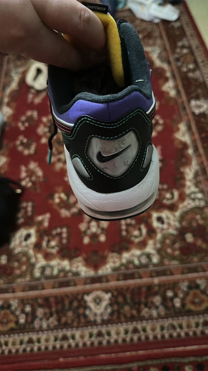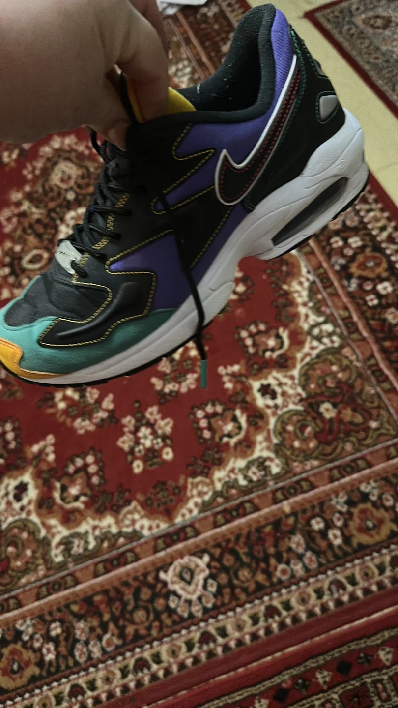Selling a pair of Nike Air Max 2 Light sneakers! They feature a unique colourway with black, purple, green, and yellow accents. These shoes are in good condition and ready for a new home!