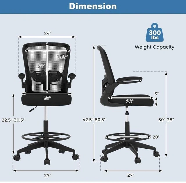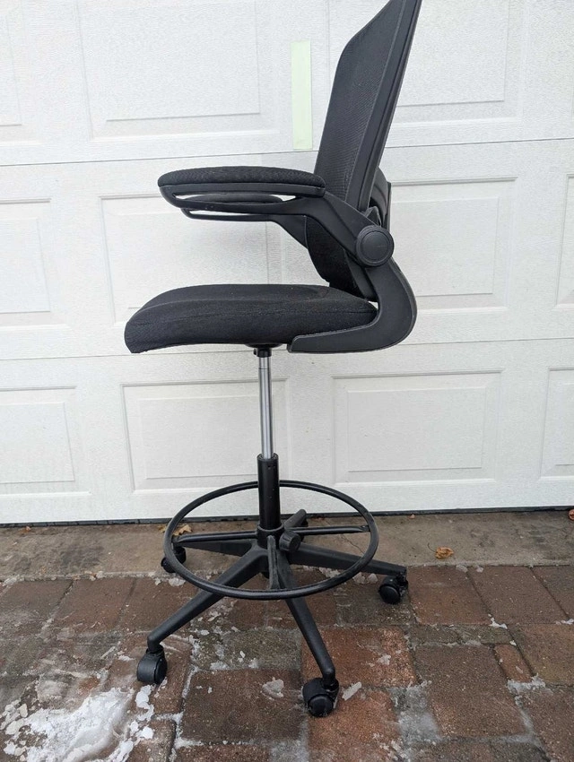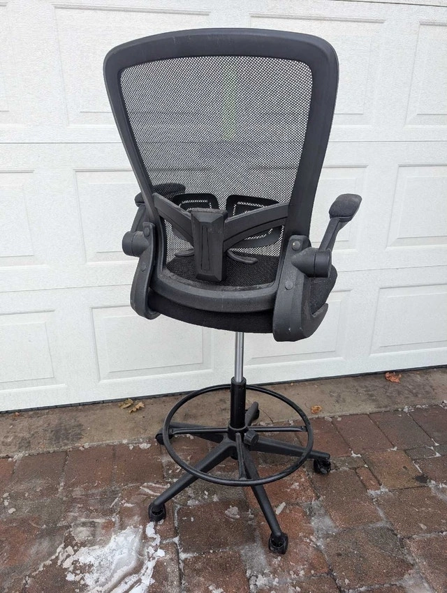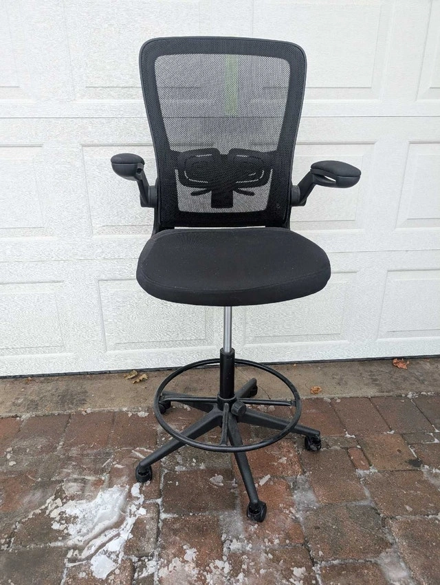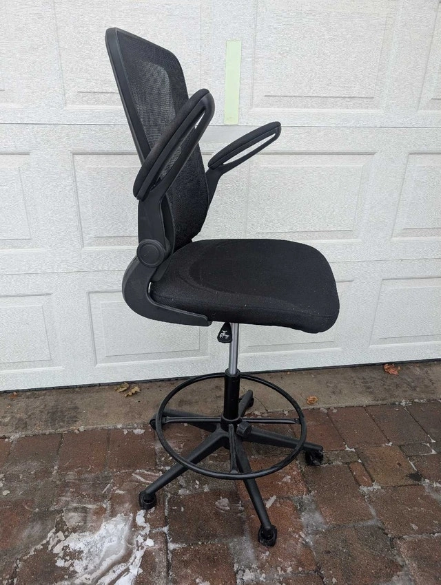 Professional-grade black mesh drafting chair with adjustable armrests, designed for comfort and support during long hours of work. The chair features a supportive mesh back, a padded seat, and an adjustable height foot ring. It's in good condition and ready to enhance your workspace. Here are some details about the chair: