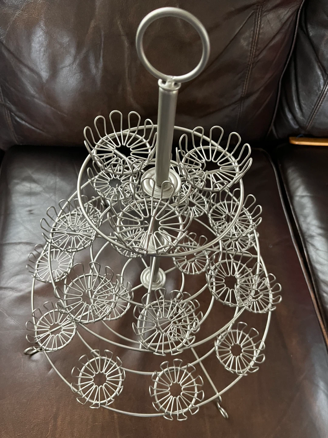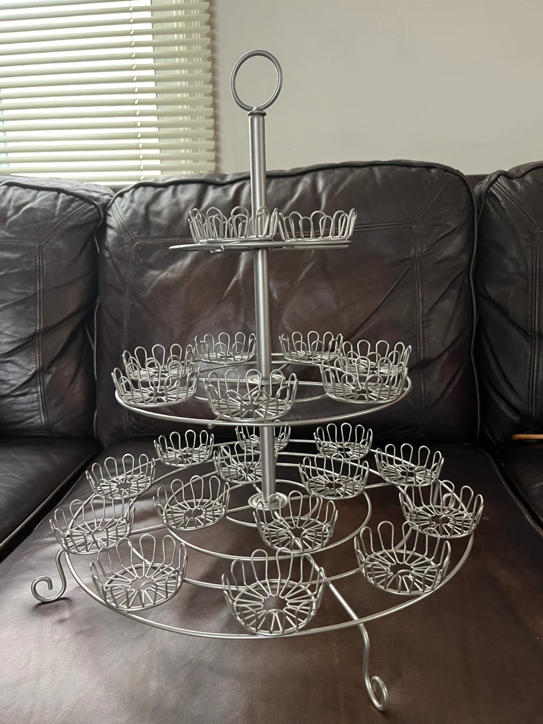 Selling a three-tier metal cupcake stand! It's perfect for displaying cupcakes, muffins, or other treats at parties or events. It's in great condition and ready to use for your next gathering