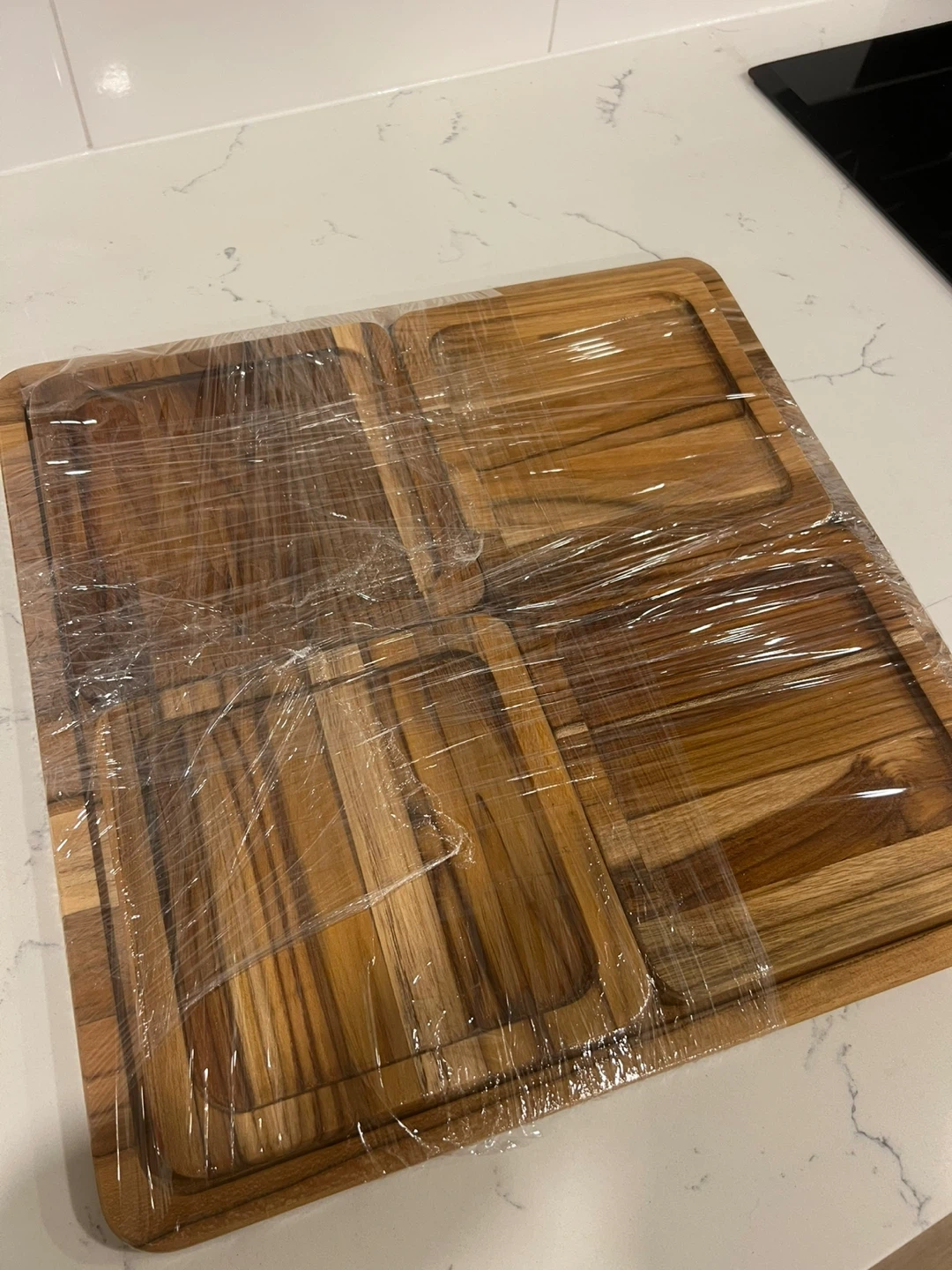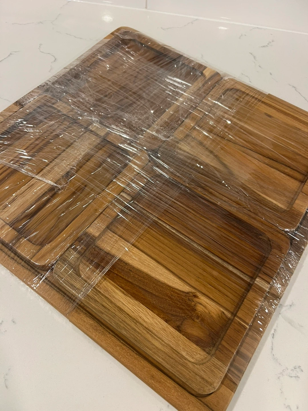 Selling a wooden serving tray, still in its original packaging! It's a great piece for entertaining or adding a touch of rustic charm to your home. The tray features divided sections, perfect for arranging snacks or appetizers.