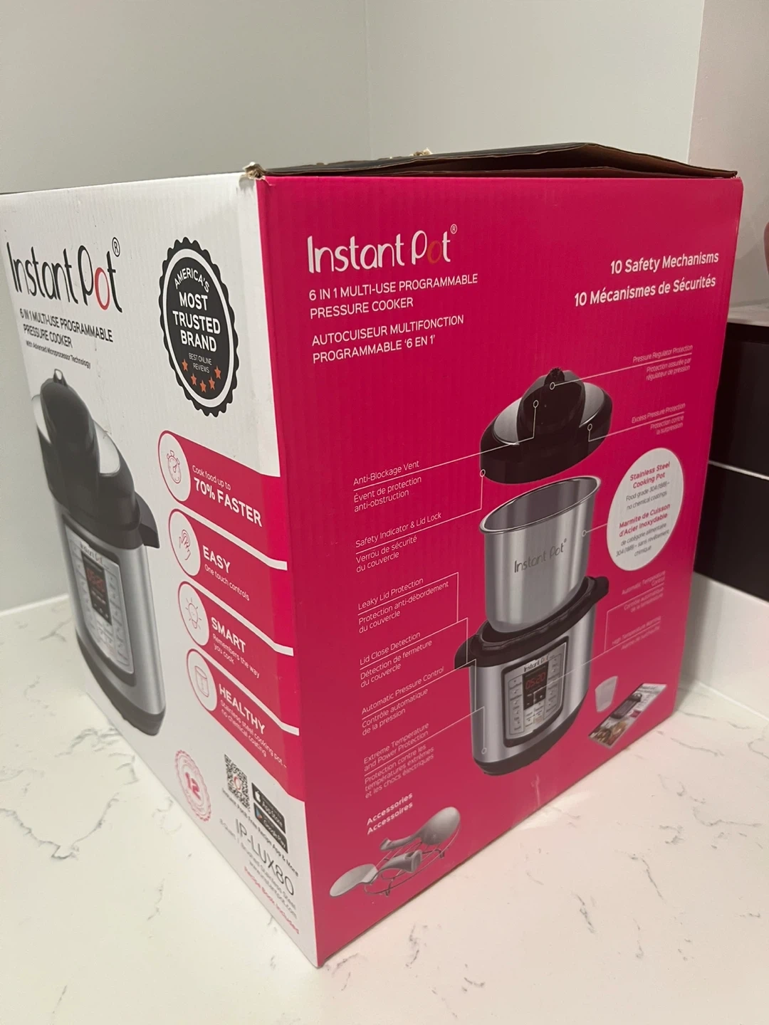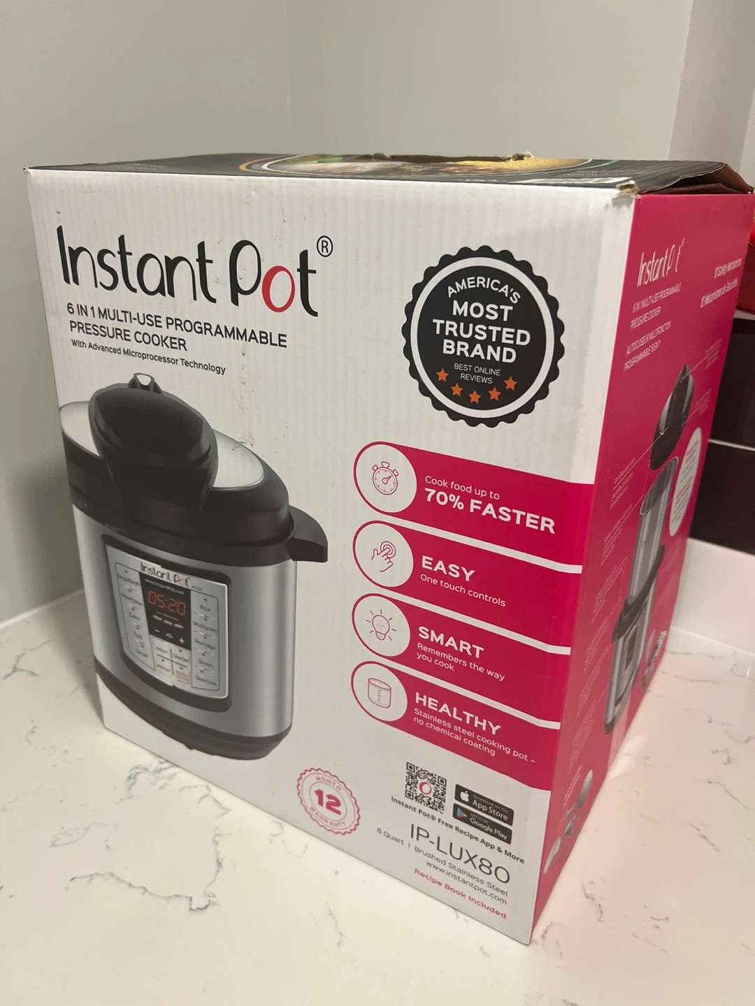 Selling an Instant Pot 6-in-1 multi-use programmable pressure cooker. It's the IP-LUX80 model with an 8-quart capacity. The box says it cooks food up to 70% faster. It's easy to use with one-touch controls, and it's smart, remembering the way you cook. The stainless steel cooking pot is healthy and chemical-free. A recipe book is included, and the box is included as well