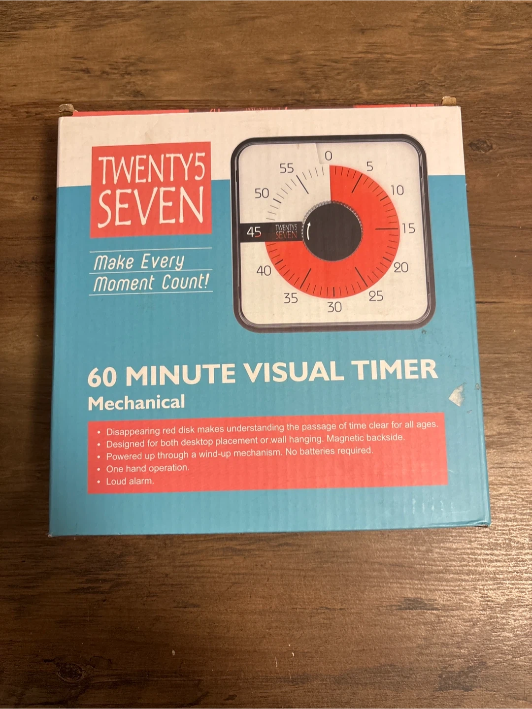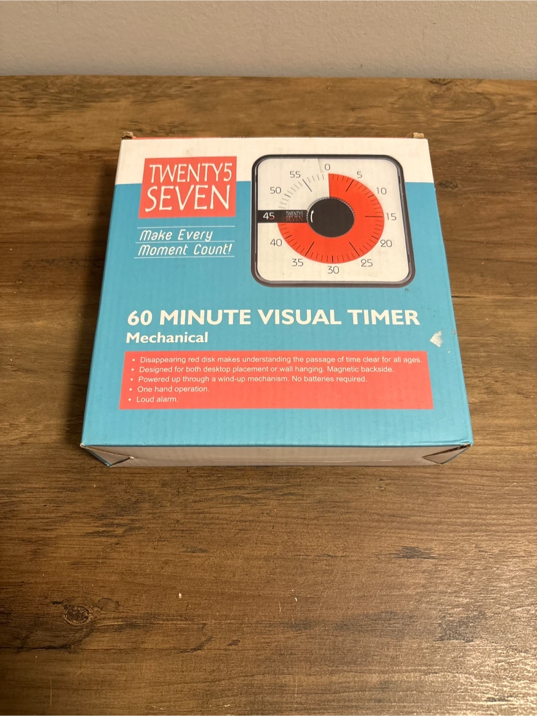 Selling a brand new Twenty5 Seven 60 Minute Visual Timer! It's mechanical, so no batteries are required. The disappearing red disk makes it easy to understand the passage of time. It can be placed on a desktop or hung on a wall, thanks to its magnetic backside. The timer is powered by a wind-up mechanism and features one-hand operation and a loud alarm. Comes in the original box!