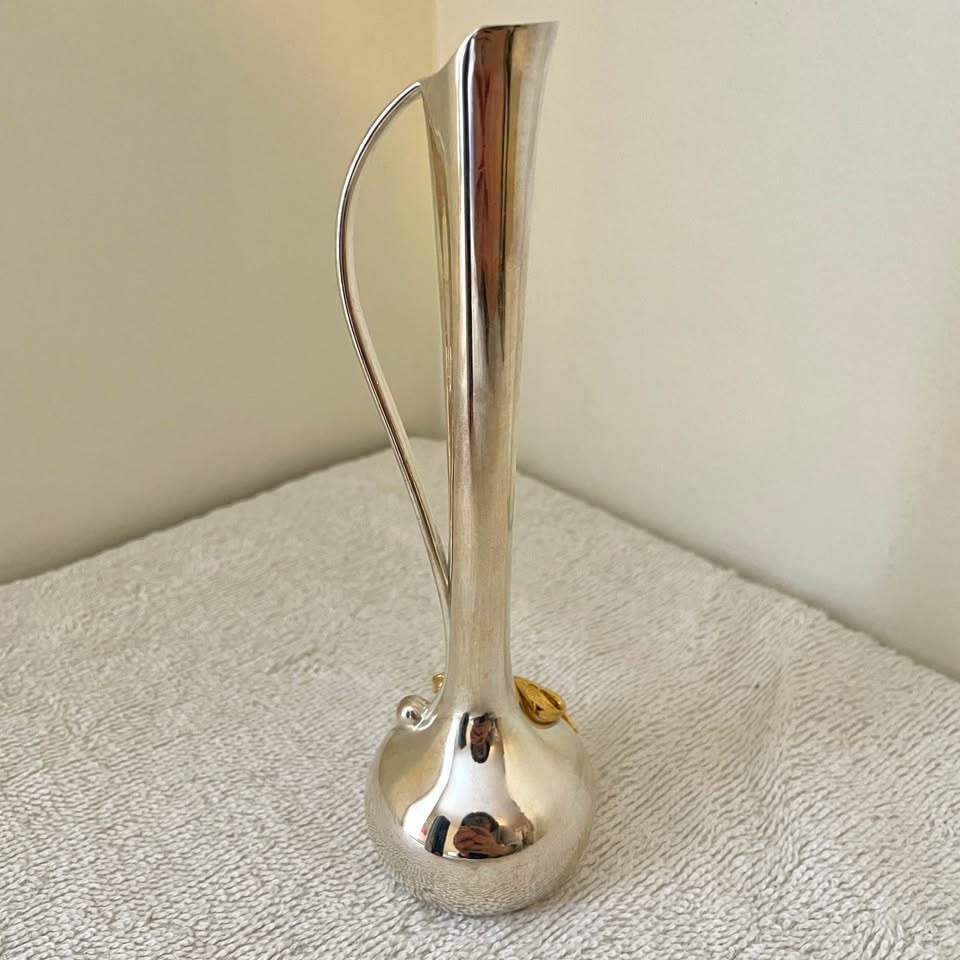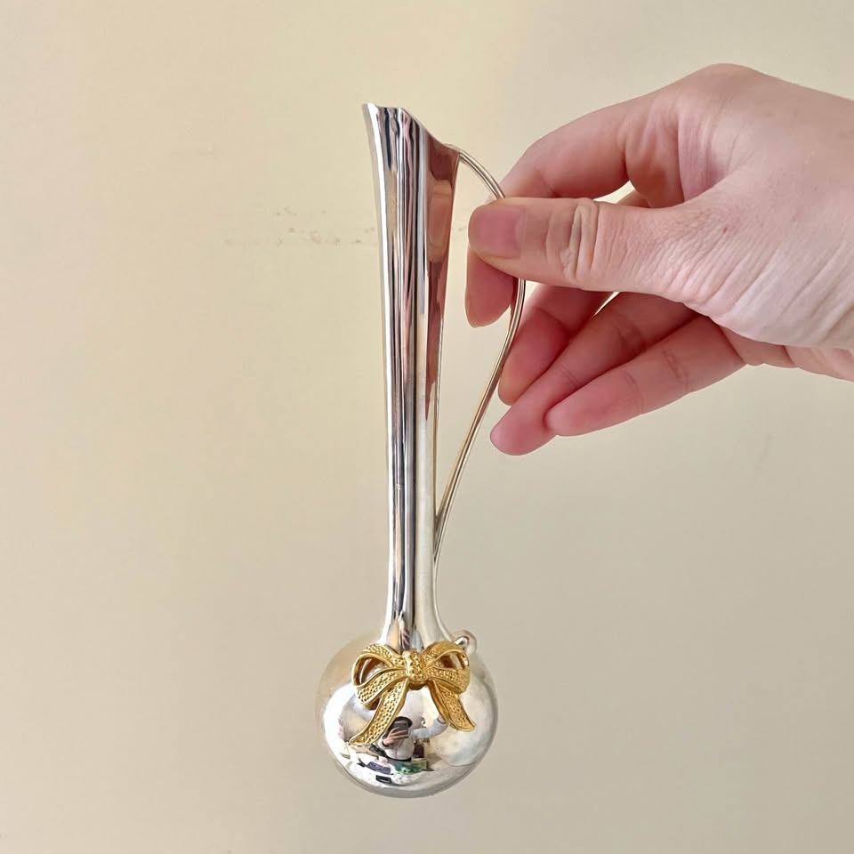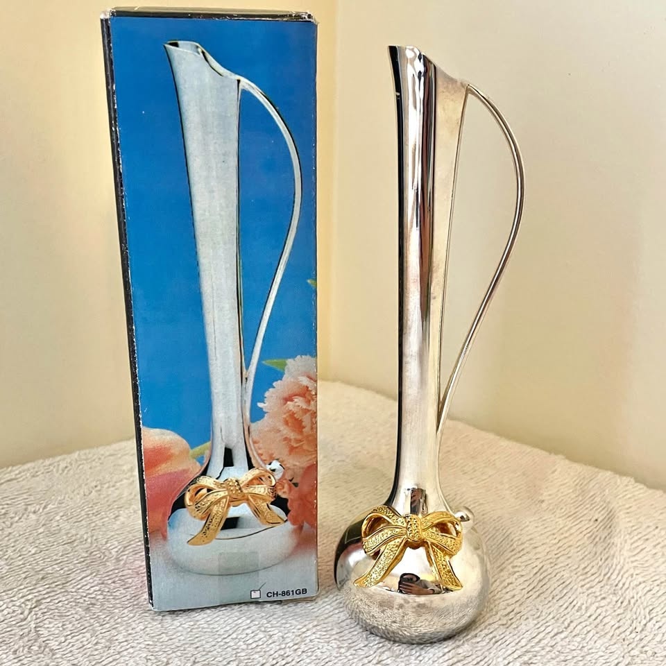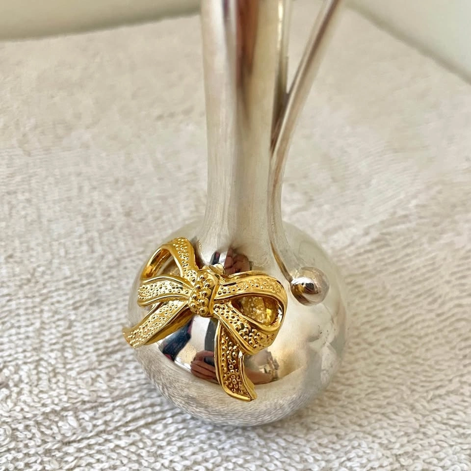 Beautiful silver-plated bud vase featuring a sleek, modern design with a curved handle and a charming gold-toned bow accent at the base. Perfect for displaying a single stem or small floral arrangement.