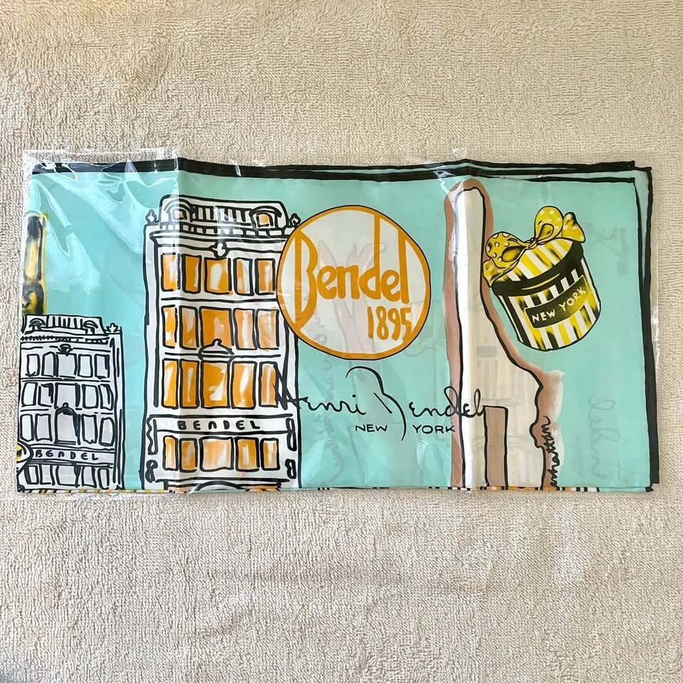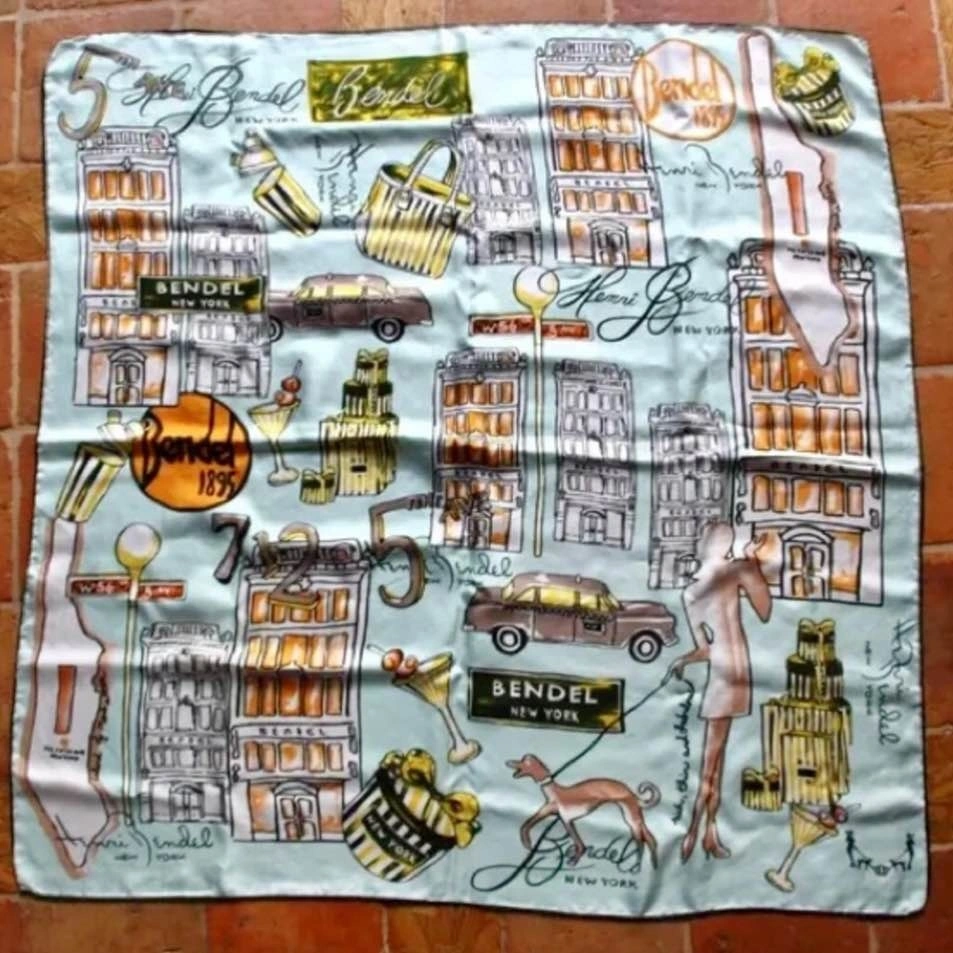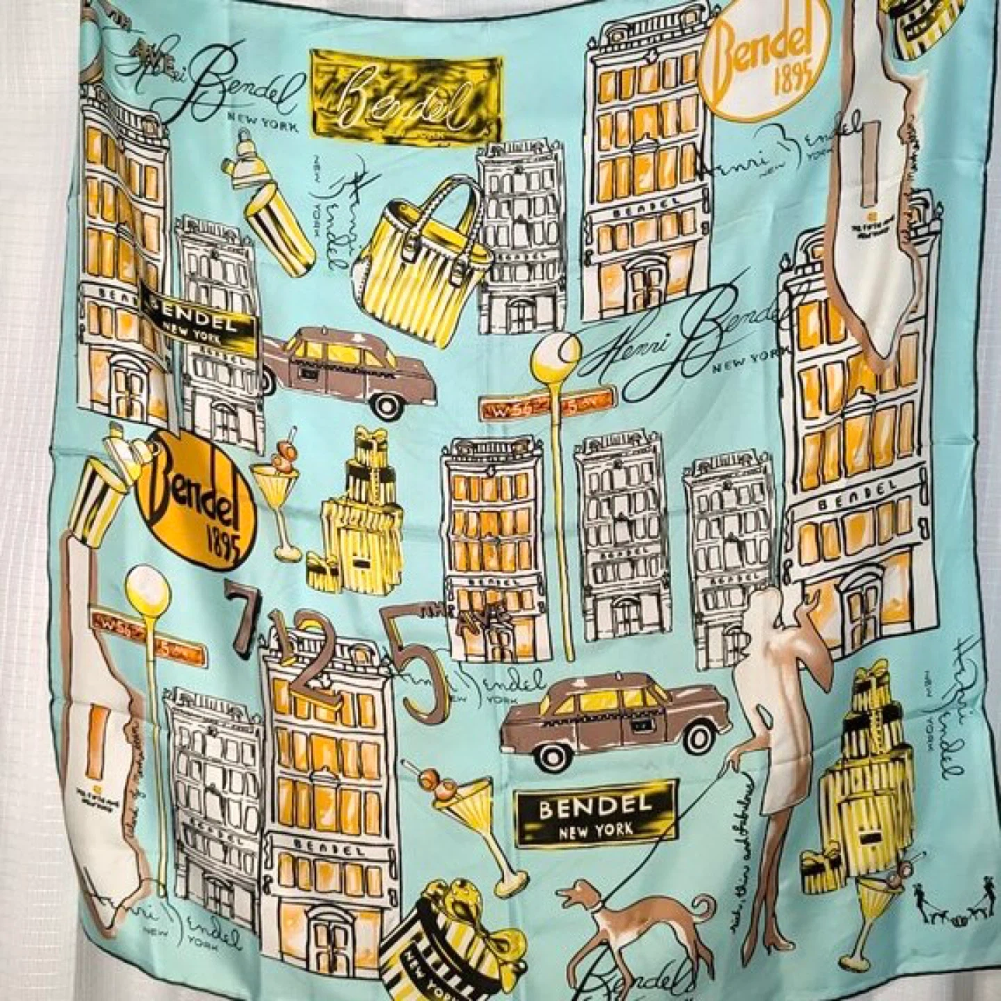 Authentic vintage Henri Bendel silk scarf featuring the iconic 5th Avenue flagship store, Bendel stripes, NYC taxis, and fun pop style illustrations.
