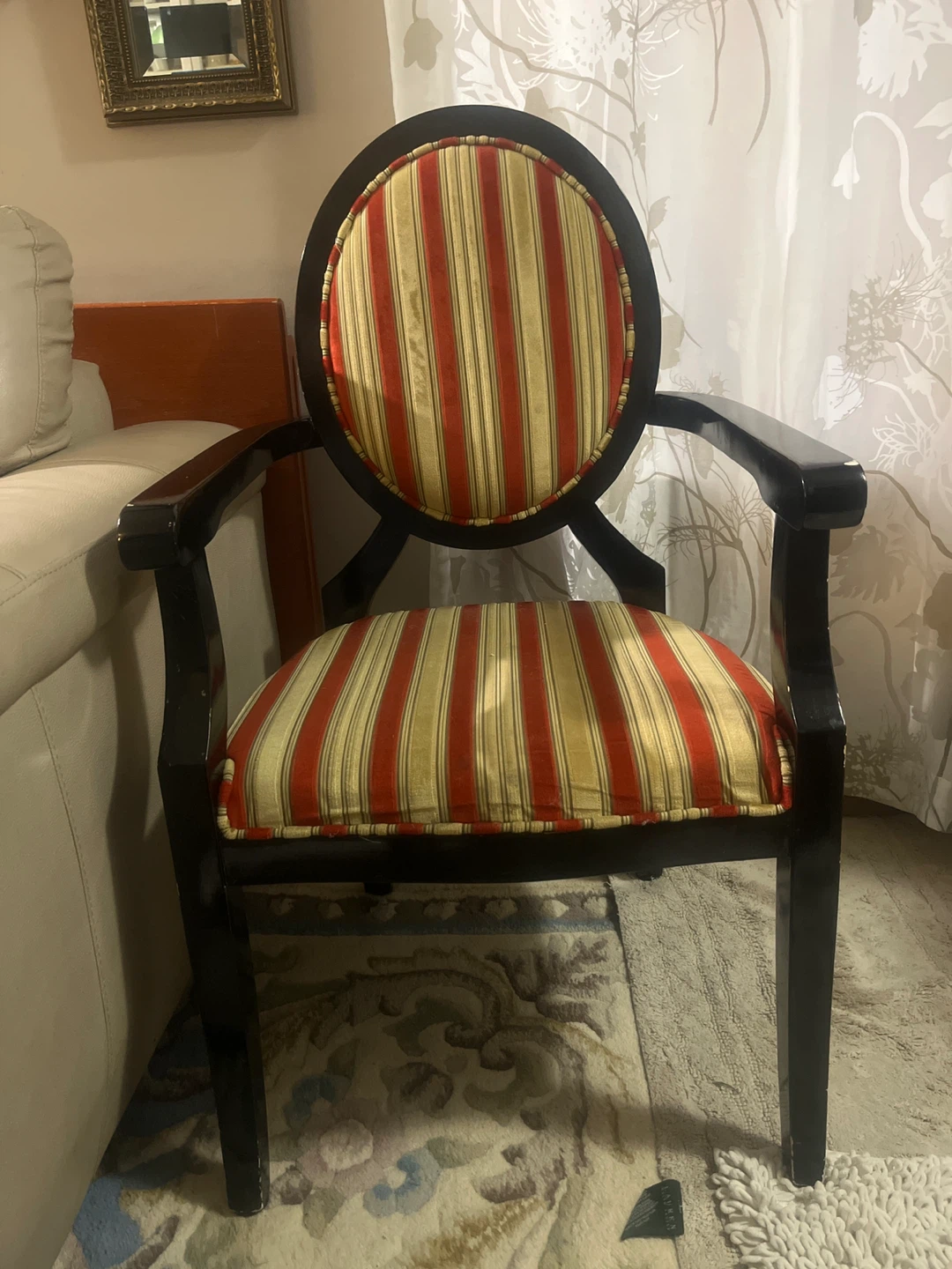 Selling a lovely accent chair with a red and gold velvet striped pattern. The frame is black. It's in good condition and would look great in any room! I will sell individually for $15 per chair or $50 for all 4 of them. There are a few chips that can easily be fixed. I can deliver for an extra fee.