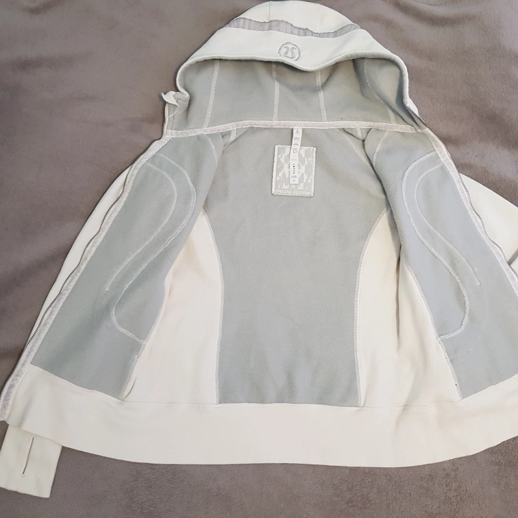 Lululemon Scuba Hoodie, specifically a special edition version known as the "Pleated Tape" style. The color is called Ghost, which is an off-white or light grey shade. D1/ 8