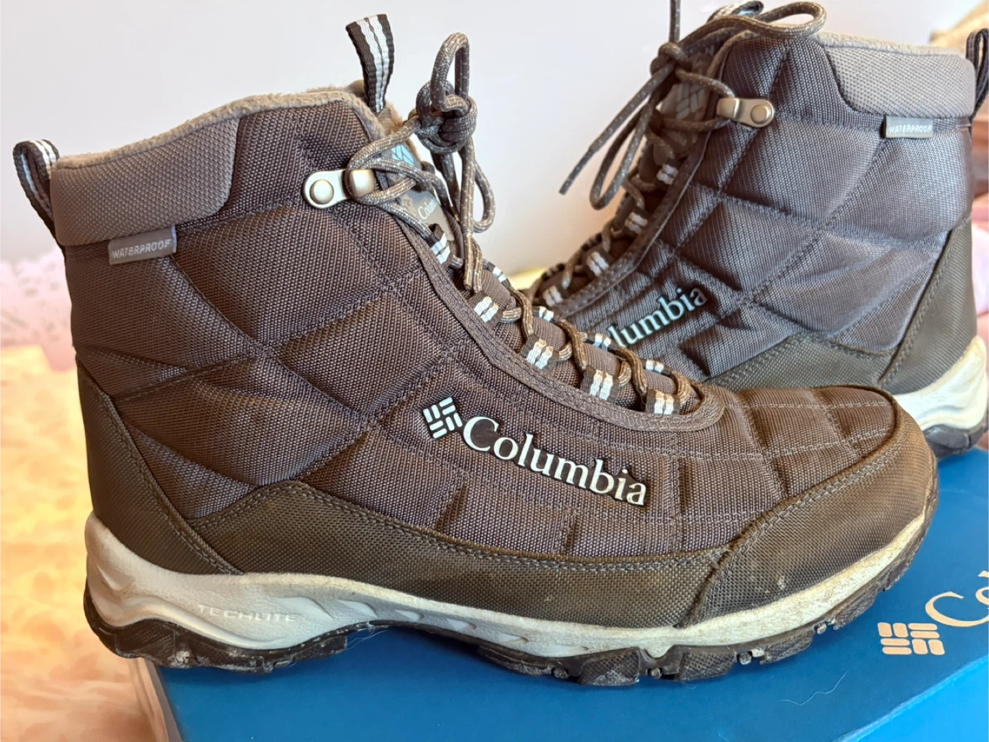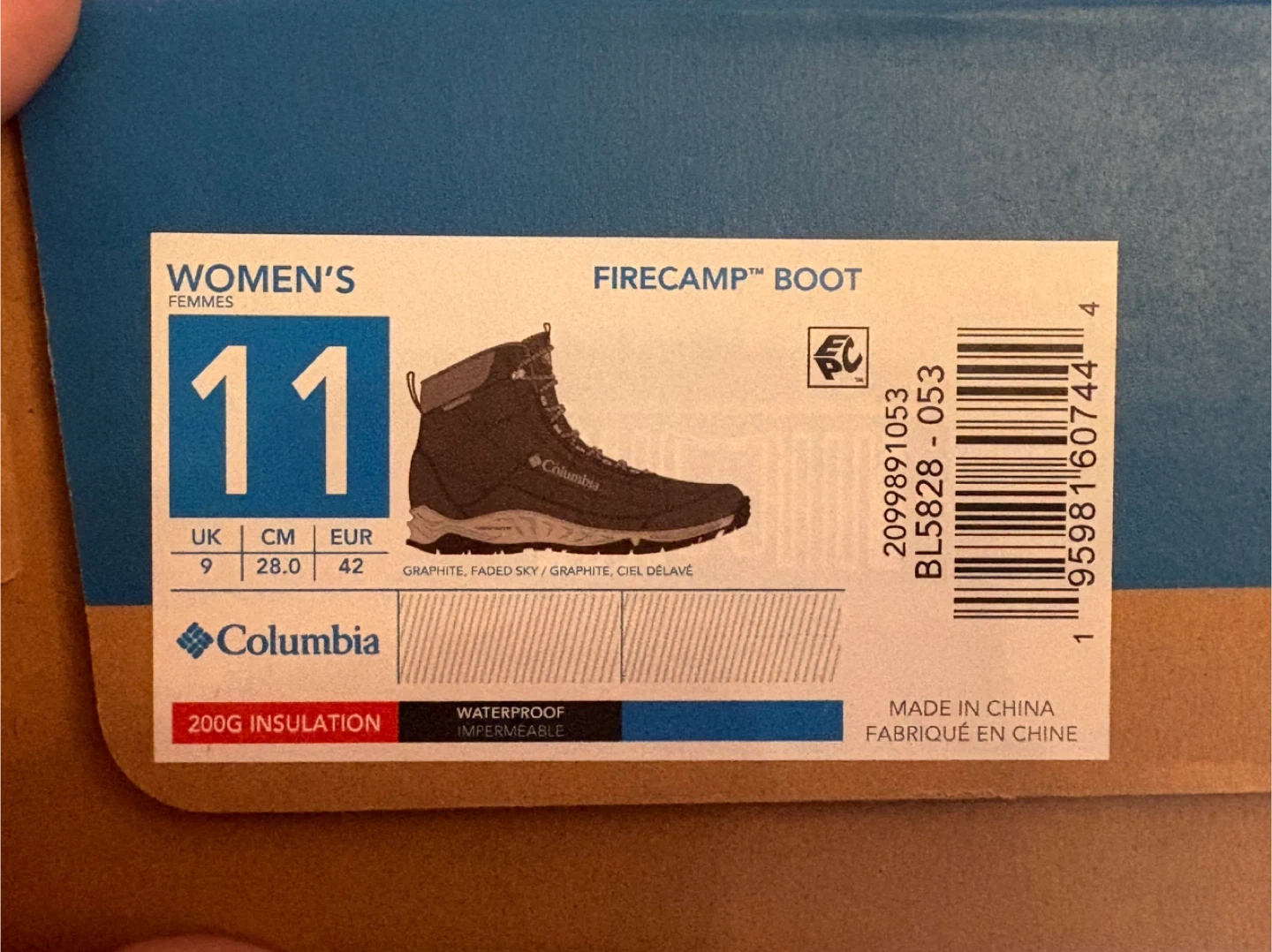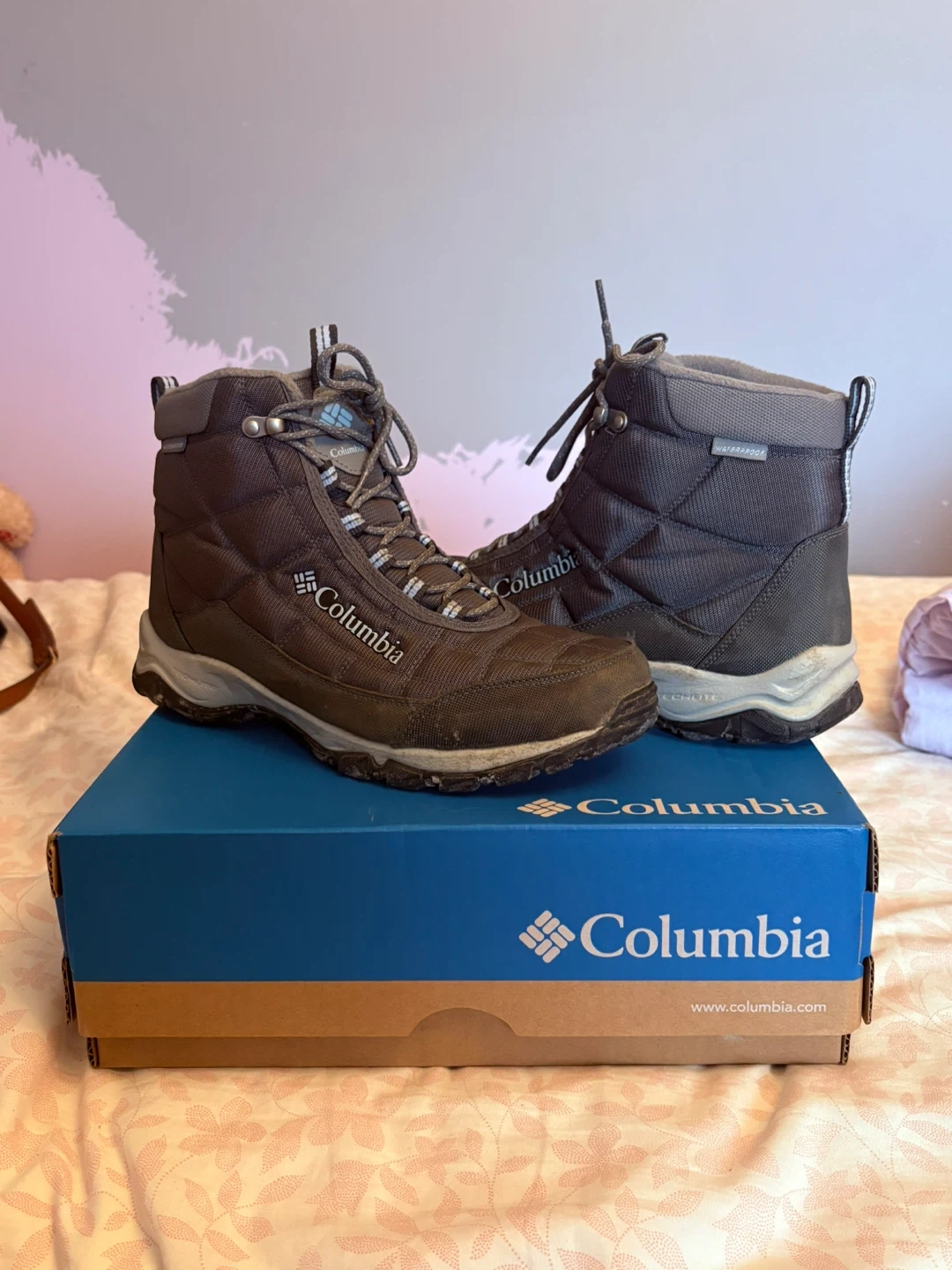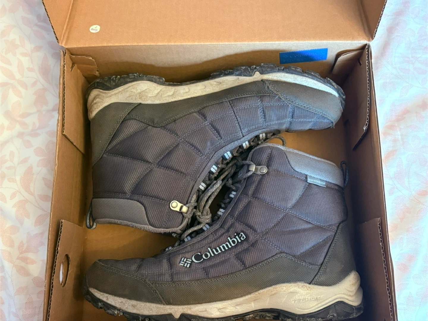 Selling a pair of Columbia Firecamp boots in women's size 11. The colour is graphite/faded sky. These boots are waterproof and have 200g insulation. They come with the original box!