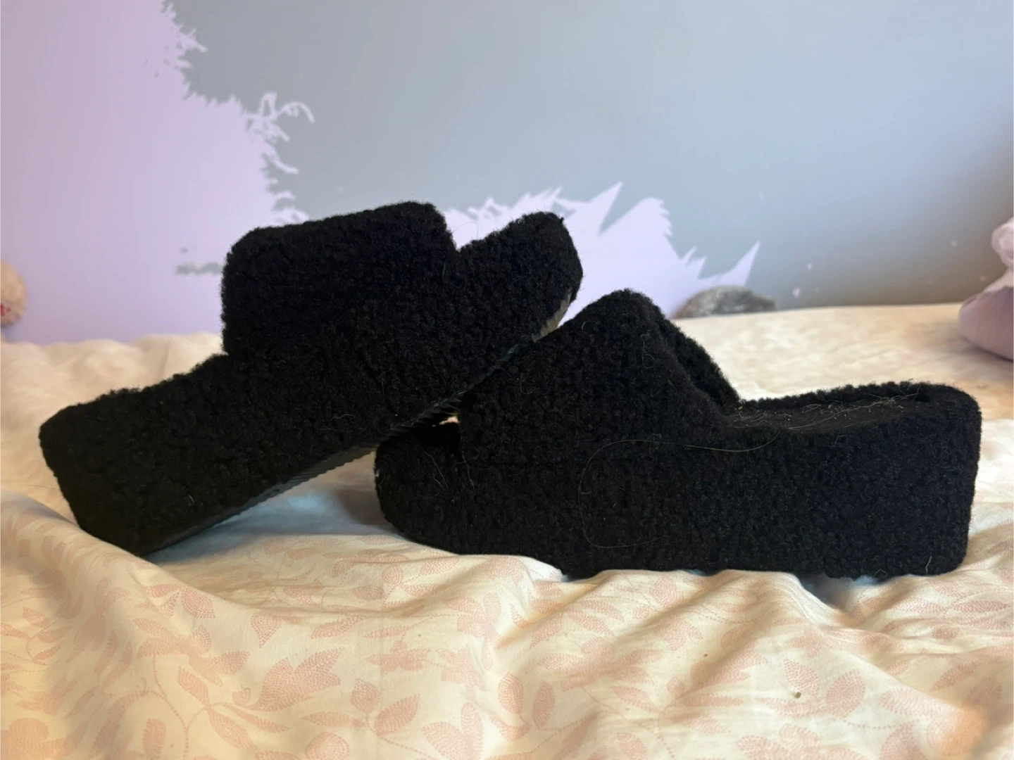 These are a pair of black fuzzy platform slides. They are in used condition, as shown in the photos. They would be great for wearing around the house or even out and about! Size 9 womens