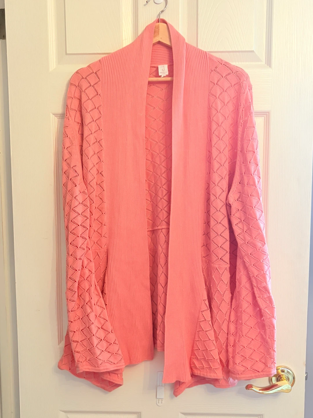 A pretty pink cardigan from J Jill! It's in great condition and perfect for layering on those cooler days. The open-front design and knit pattern make it a stylish and comfy addition to any wardrobe