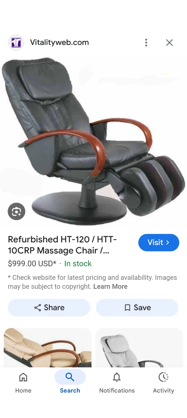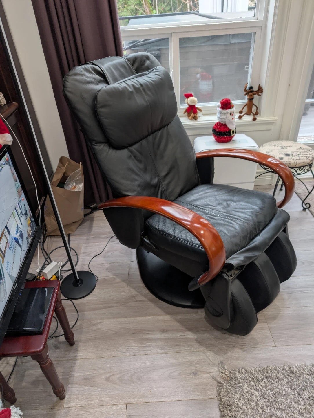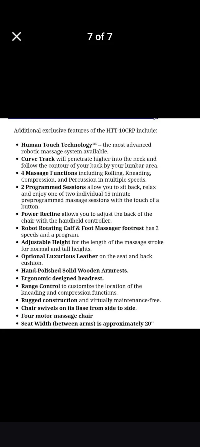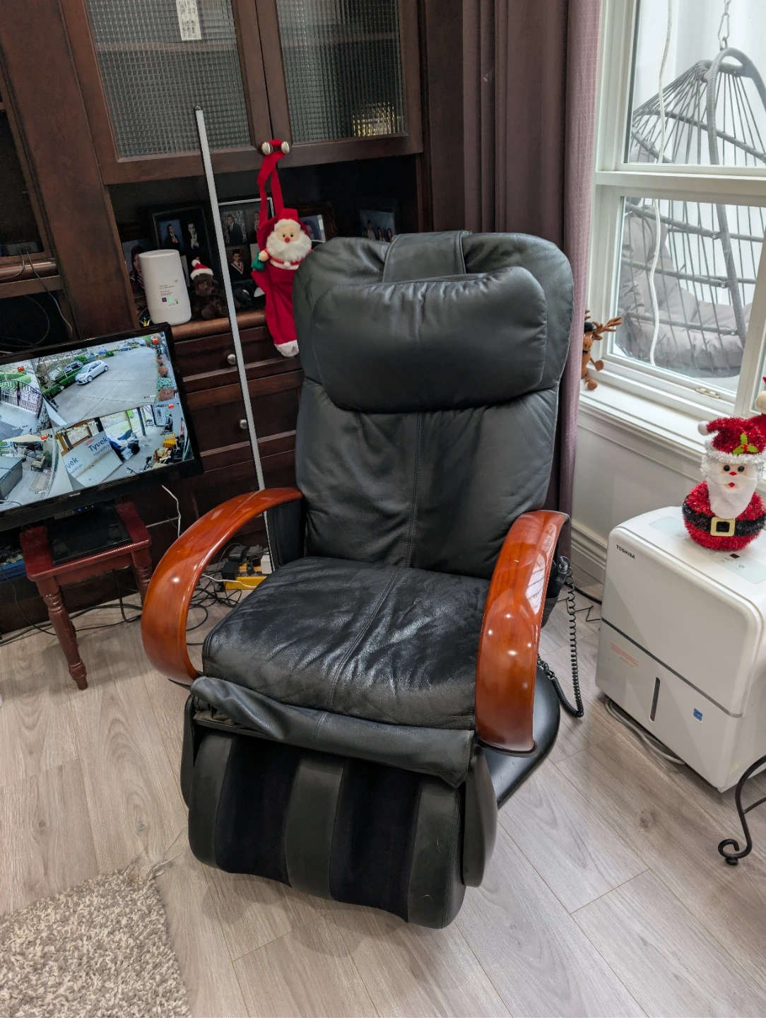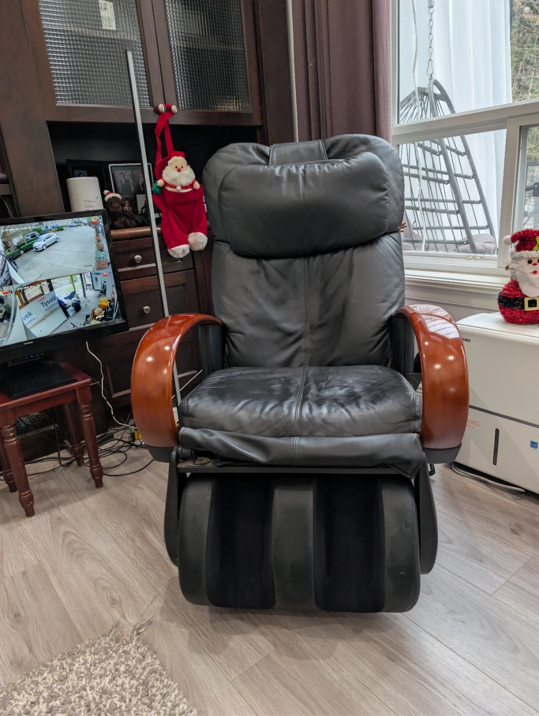Leather massage chair by Human Touch Technology (Model No. HTT-CRP10) . All massage functions work, although the roller mechanism is a little loud. It offers compression, percussion, kneading and rolling massage functions. These pre owned still sell for approximately $1,000 USD on various websites. It is heavy and will require two people to lift and a suitable mode of transportation.