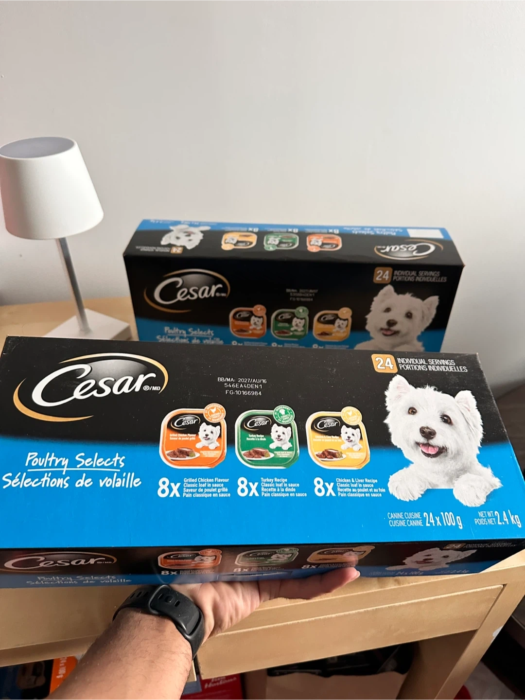 Selling a box of Cesar Poultry Selects dog food! It's a variety pack with Grilled Chicken, Turkey, and Chicken & Liver recipes. Each box contains 24 individual servings (24 x 100g). Expiry Date: 2027 August 16