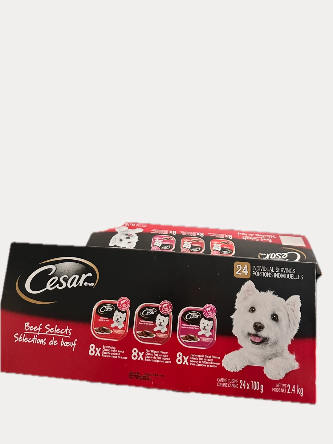 Selling a 24-pack of Cesar Beef Selects dog food! Each pack contains 24 individual servings, perfect for your furry friend. Includes a mix of Beef Recipe, Filet Mignon Flavour, and Porterhouse Steak Flavour in classic loaf in sauce. Net weight is 2.4 kg.