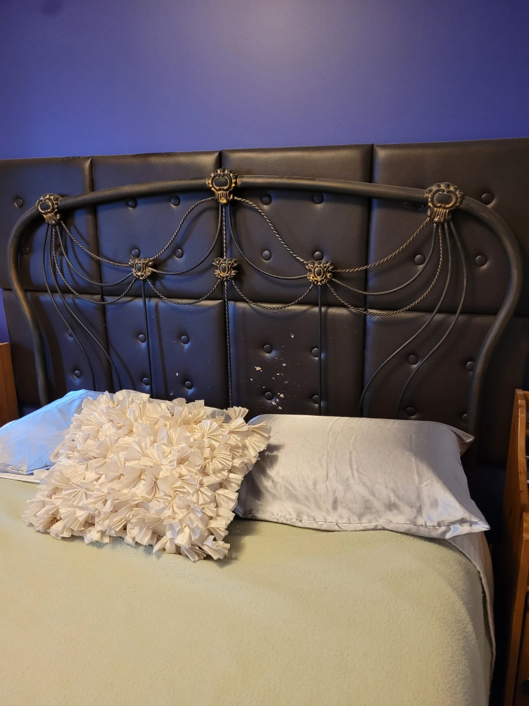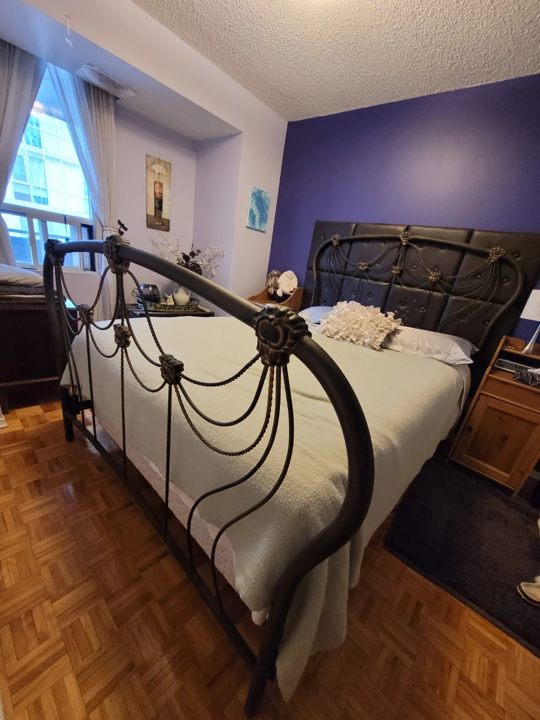 Selling a detailed bronze/black metal queen sized headboard and footboard. It's in great condition and would add a touch of elegance to any bedroom and is a bit gothic. The unique design features decorative accents. Queen boxspring available as well, bed bug free.