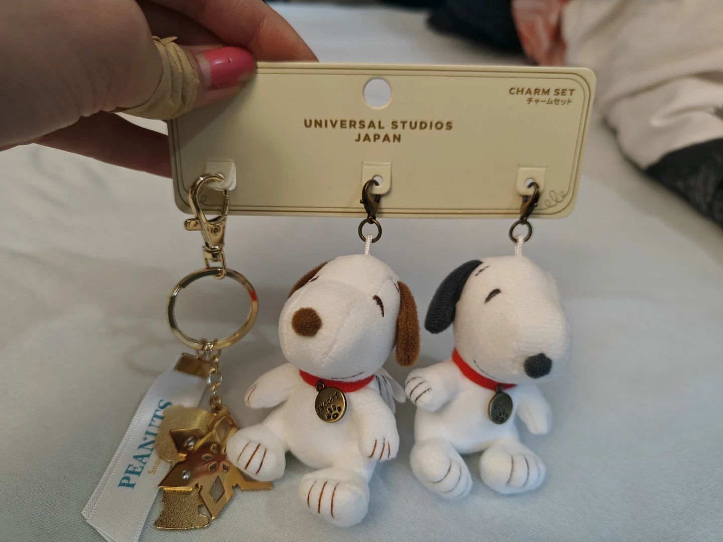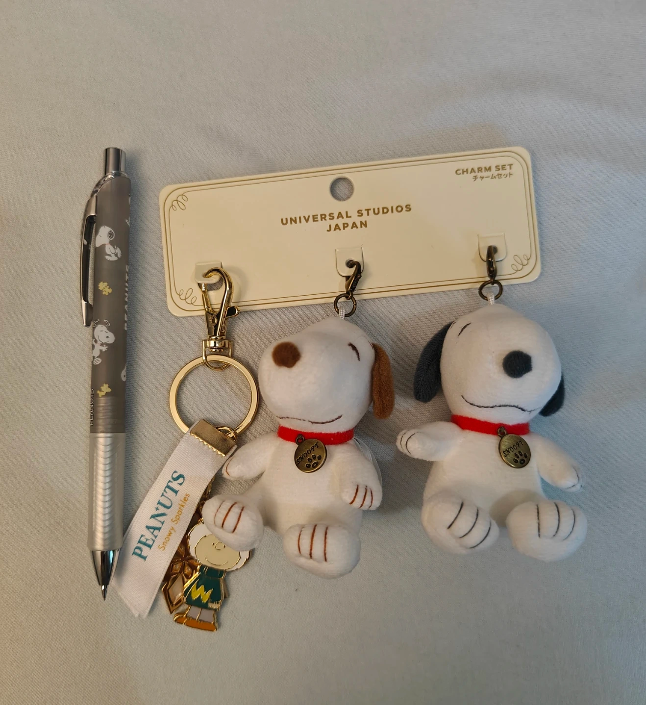 Selling a cute Peanuts charm set from Universal Studios Japan! It includes two Snoopy plush charms and a Charlie Brown keychain. Also included is a Peanuts mechanical lead pencil, perfect for any fan!