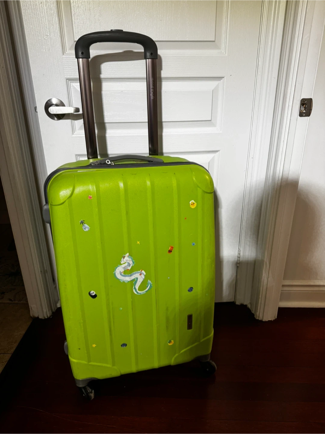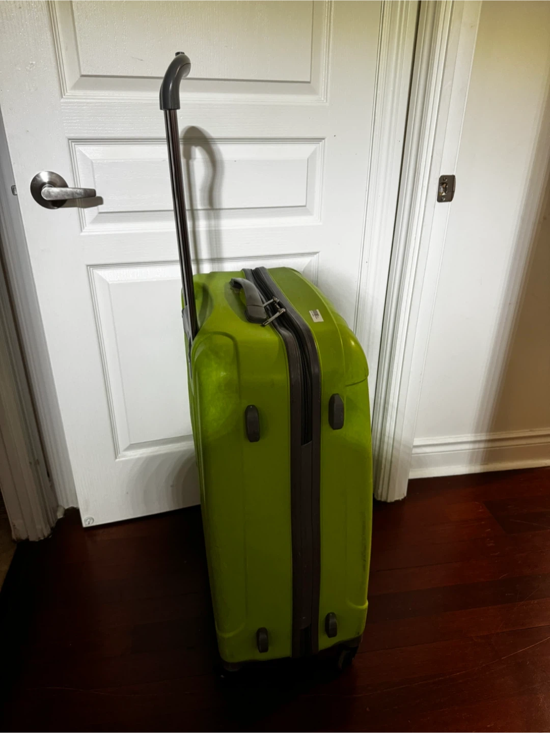 Selling a British Knight suitcase in a vibrant green color. It's got a retractable handle and wheels for easy transport. The inside is spacious with compartments to keep your belongings organized.