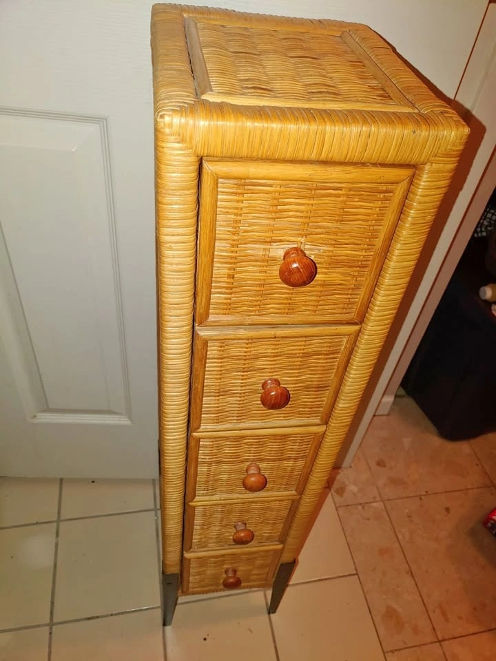 Rattan IKEA CD holder with 6 drawers in good condition. Great for CD storage, small items, or organizing shelves. I used this for gloves and scarves. Moving so must sell.