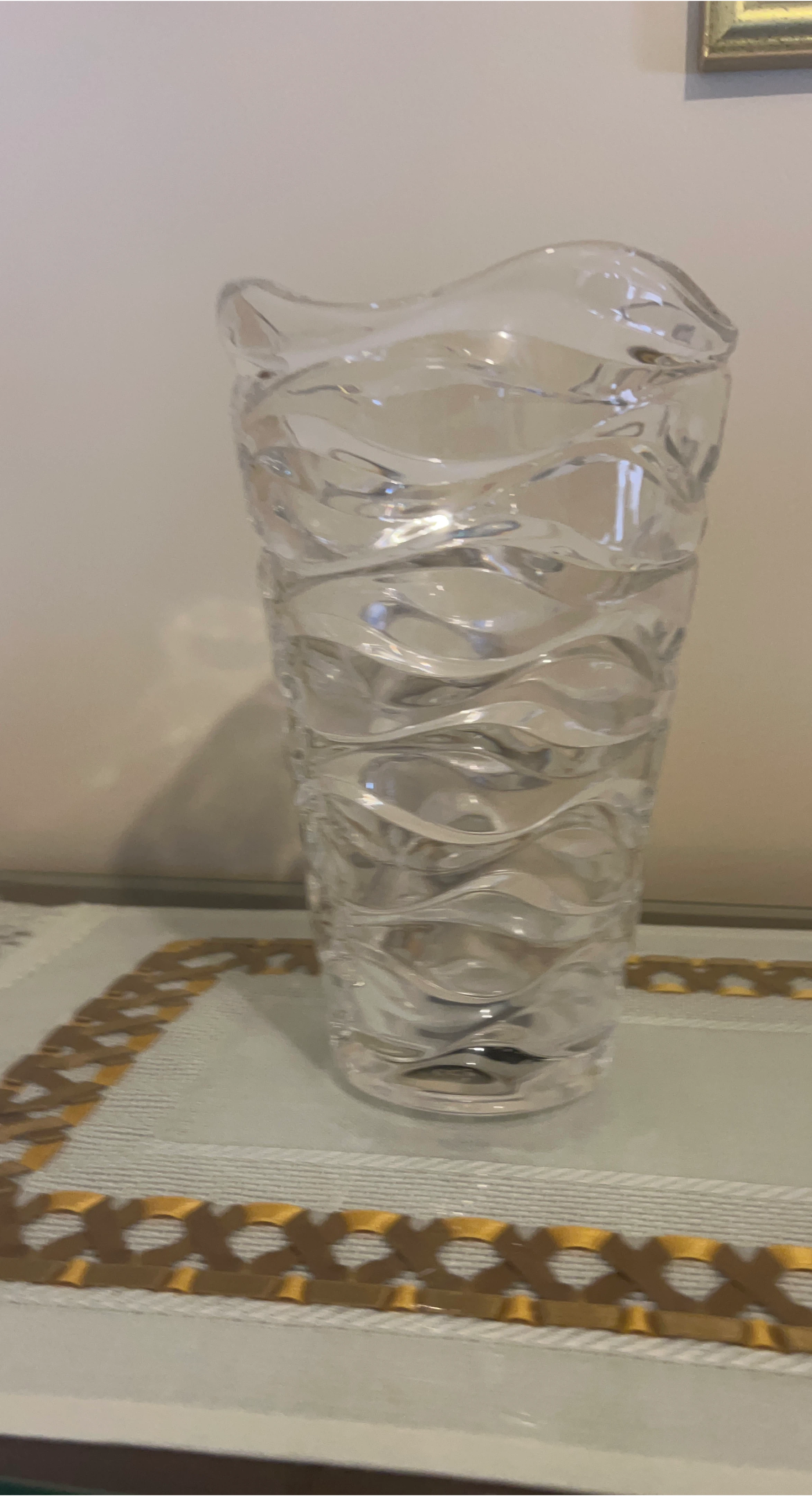 Selling a clear glass vase with a unique wavy design! It would look great with flowers or as a standalone decorative piece. It's in great condition and ready to brighten up your space