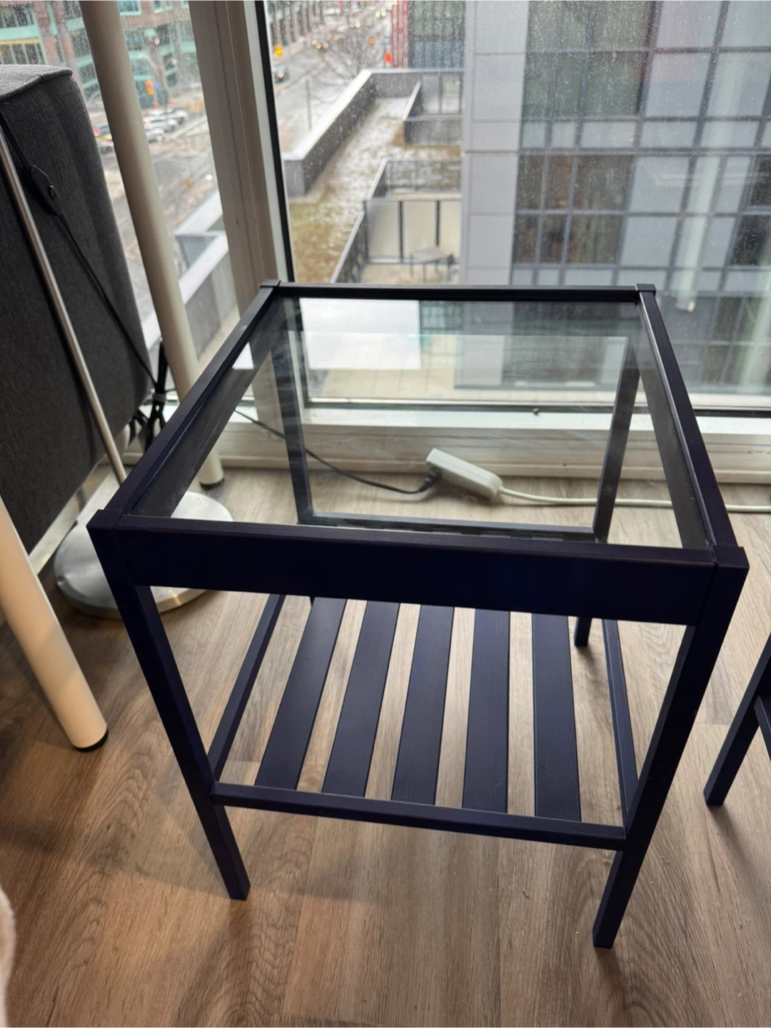 2x Blue Side Tables. It's in great shape. Made of wood and glass top. Perfect for small spaces and easy to move around. Very light also. $8 each!