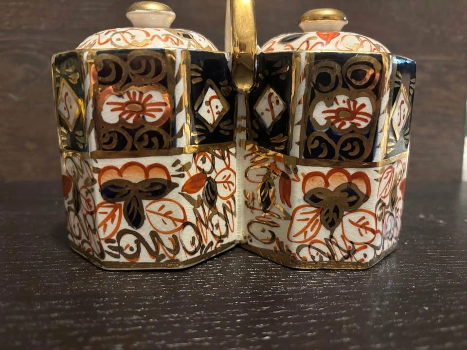5. Royal Crown Derby English porcelain Imari-pattern, gold trim dual condiment pot with handle and lids. $35