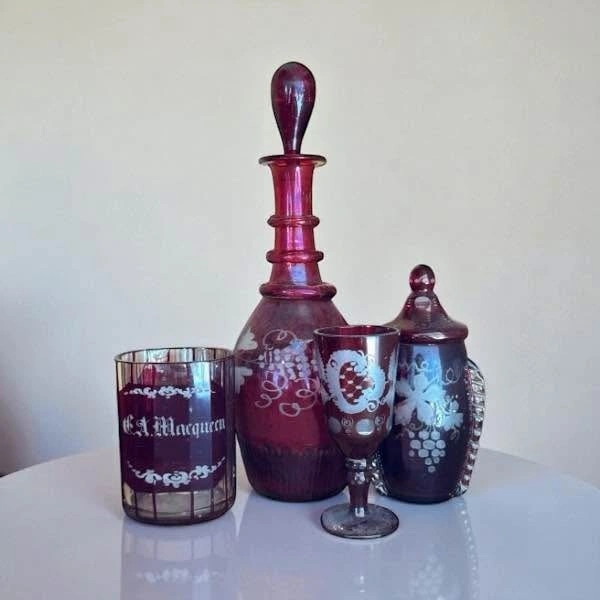 7. Vintage Bohemian Czech Ruby Red Flash Glass -decanter, goblet, small lidded jar, and tumbler. $30