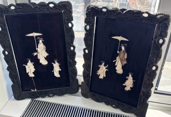 8. Pair of Asian Wall Art Panels (one cracked but Repaired)