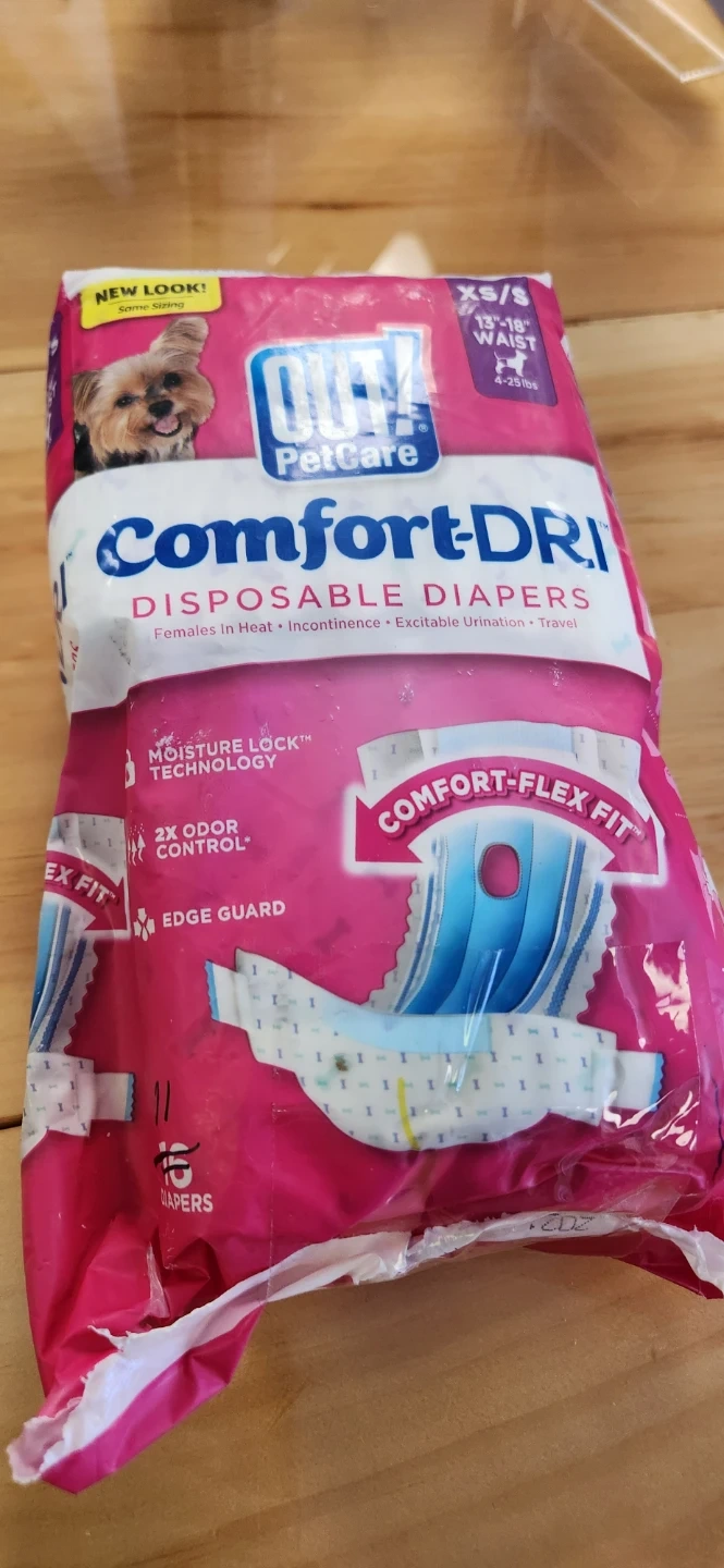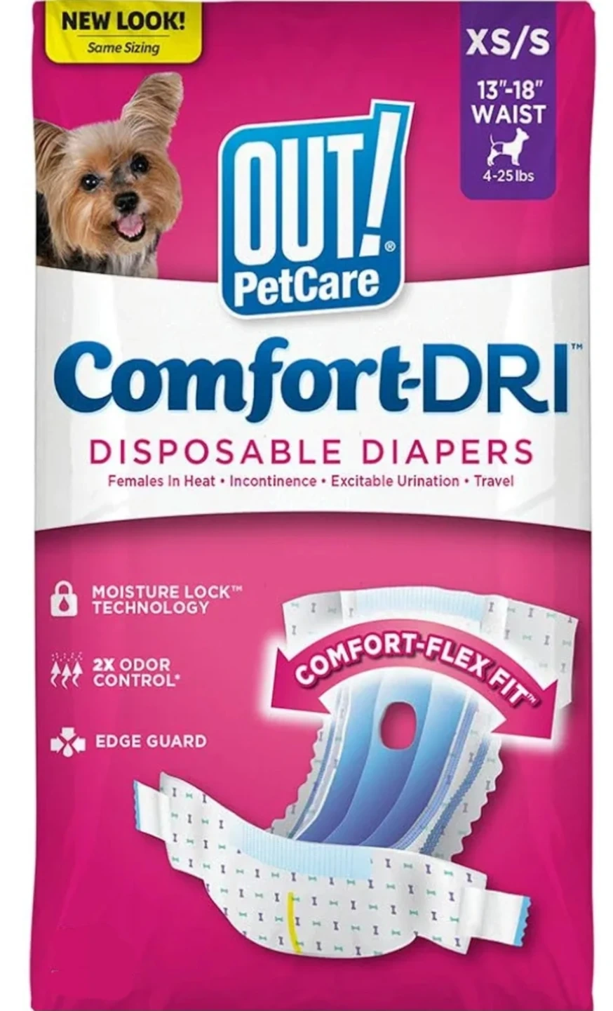 Selling a pack of OUT! PetCare Comfort-DRI disposable diapers for female dogs. Size is XS/S, designed for dogs with a 13-18 inch waist and weighing 4-25 lbs. These diapers are great for females in heat, incontinence, excitable urination, and travel. They feature moisture lock technology, 2x odor control, and an edge guard for extra protection!