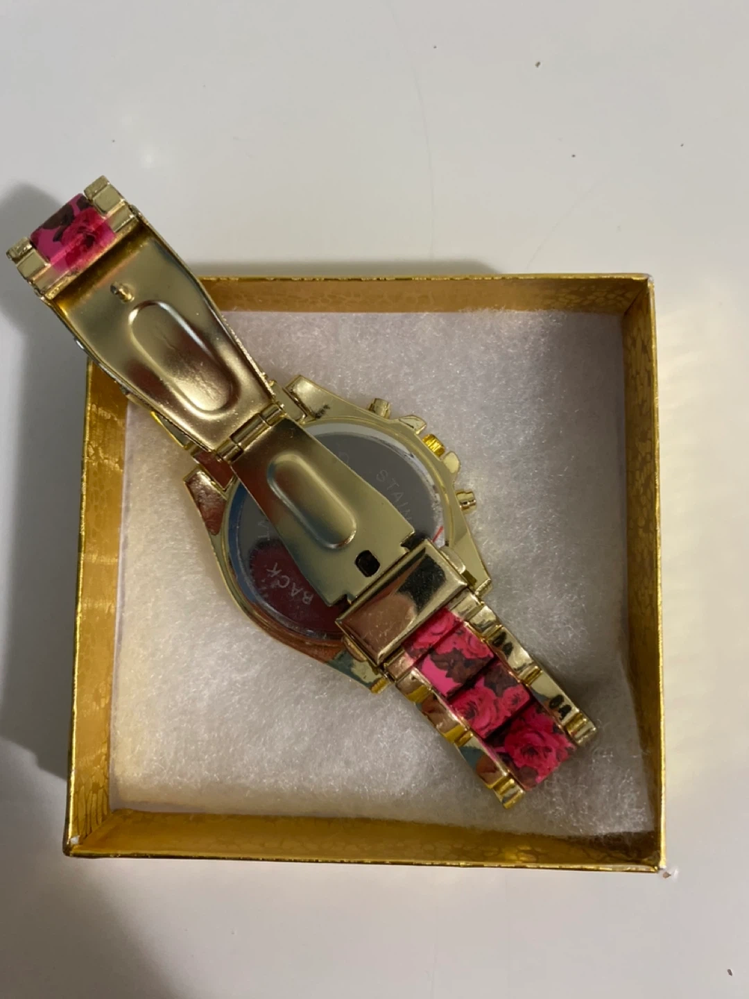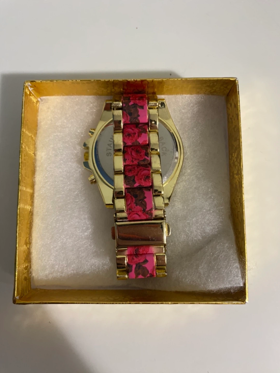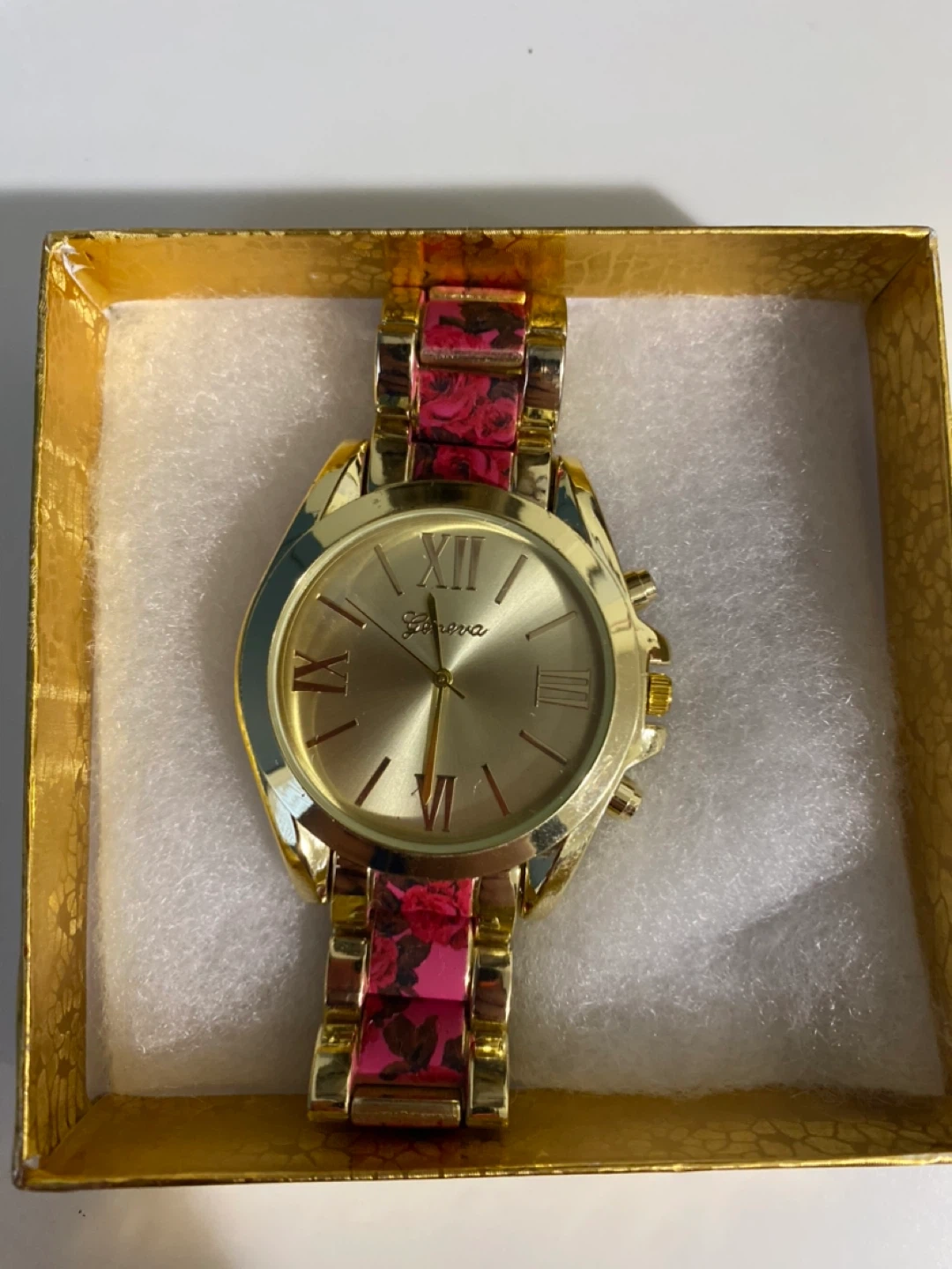 Selling a lovely Geneva watch! It features a gold-tone finish with a beautiful floral design on the band. It still has tape on the inside of the watch. Needs a battery change but it is brand new, never worn.