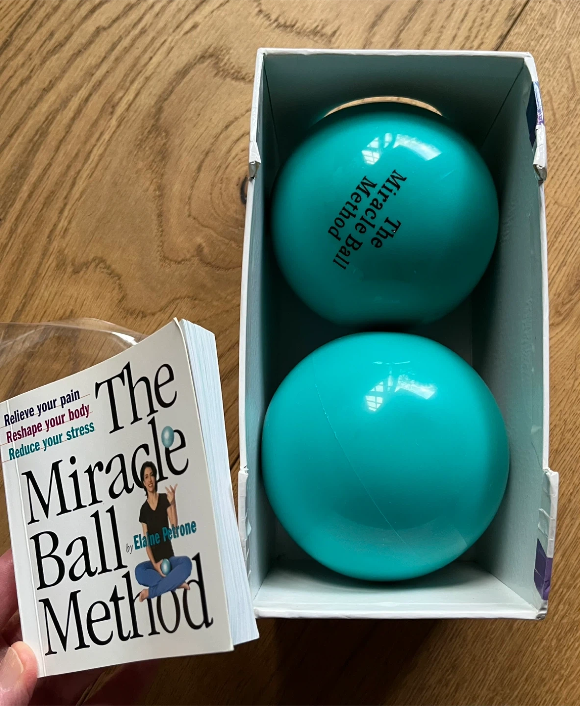 Selling The Miracle Ball Method set, which includes two balls and the accompanying book by Elaine Petrone! This set is designed to help relieve pain, reshape your body, and reduce stress. It comes with the original box