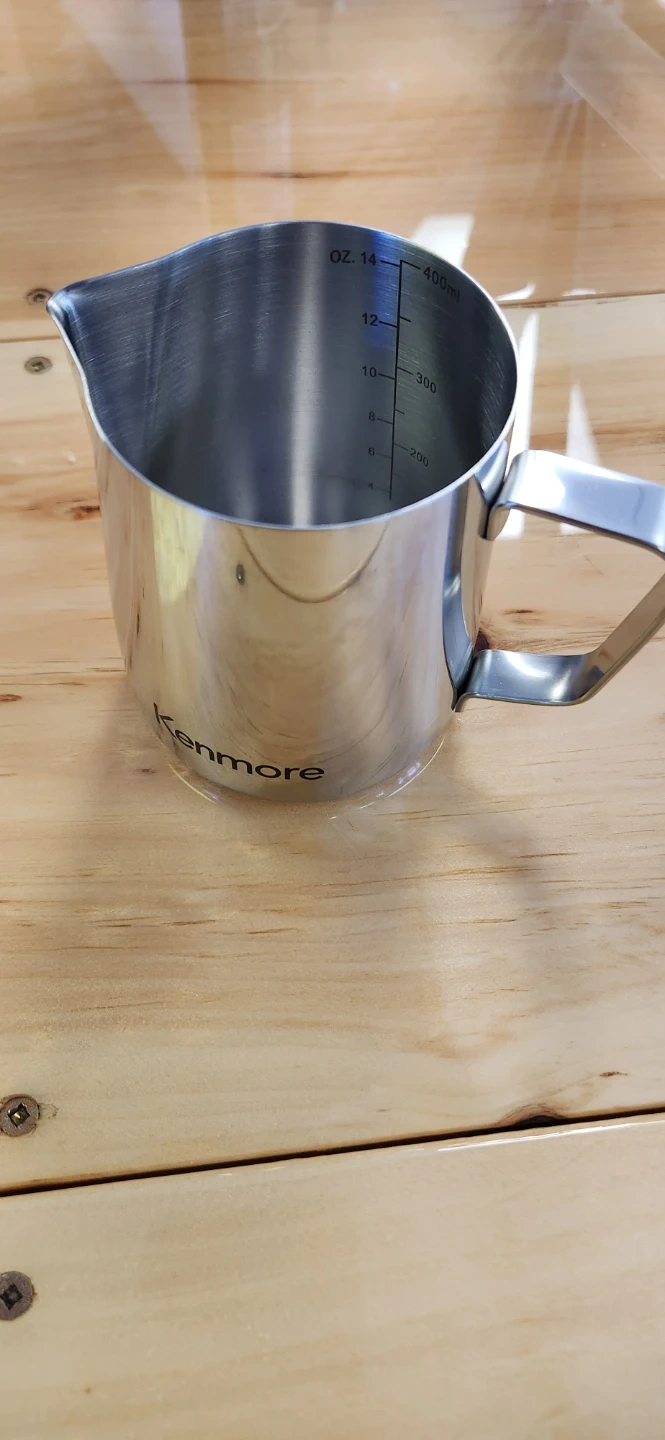 I'm selling a Kenmore milk steaming pitcher. It's made of stainless steel and has measurements marked on the inside. Perfect for making lattes or cappuccinos at home!