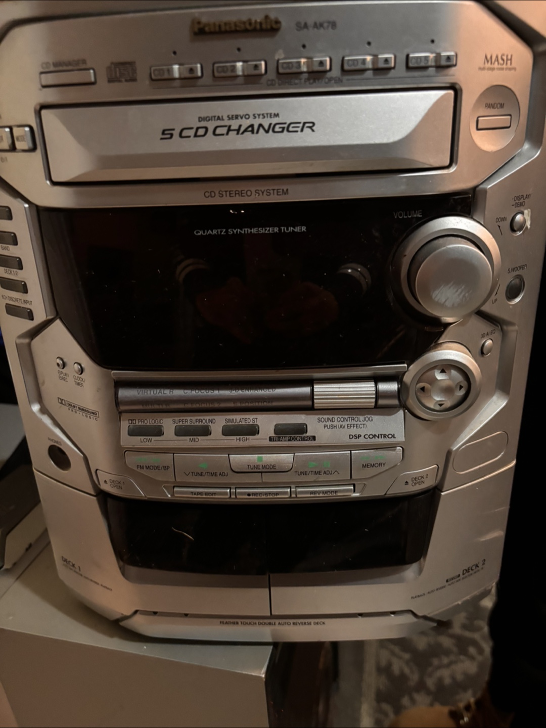 Selling a Panasonic SA-AK78 stereo system with a 5 CD changer! It features a quartz synthesizer tuner and a feather-touch double auto-reverse deck. It also has Dolby Pro-Logic surround sound. Quick sale $20 today or donated tomorrow.
