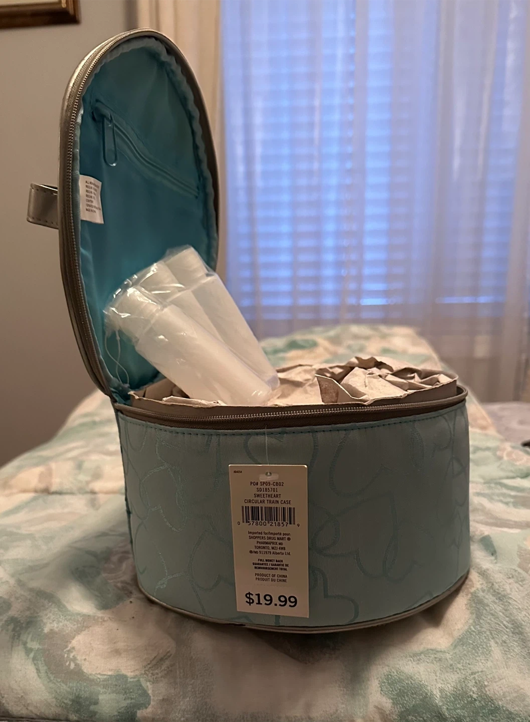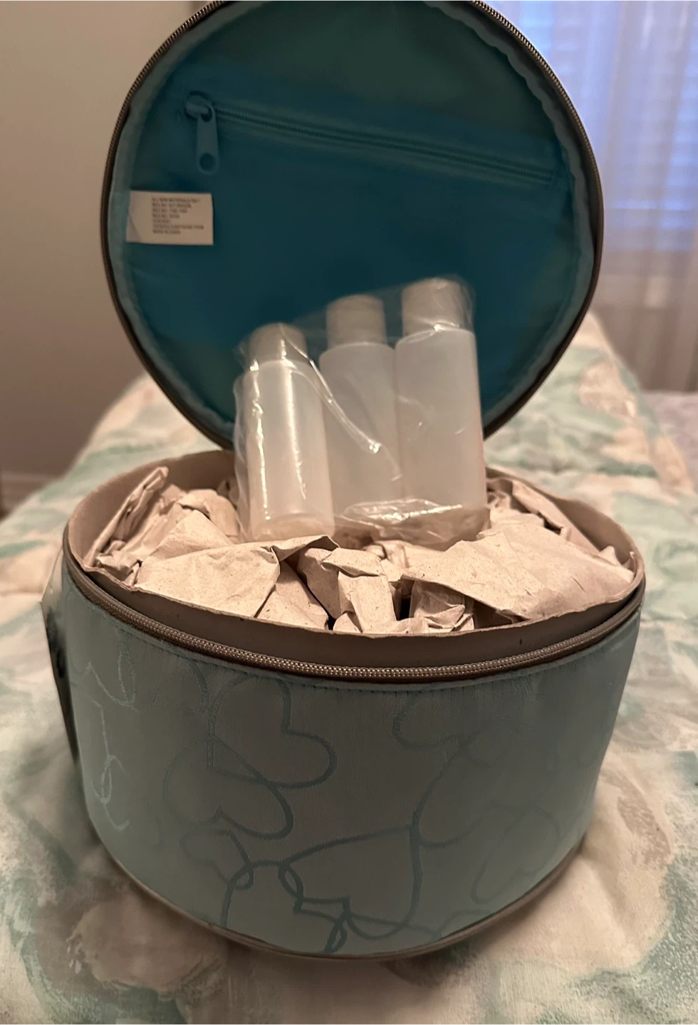 This is a circular train case, perfect for storing makeup or toiletries! It's in great condition and ready to go. Originally bought for $19.99