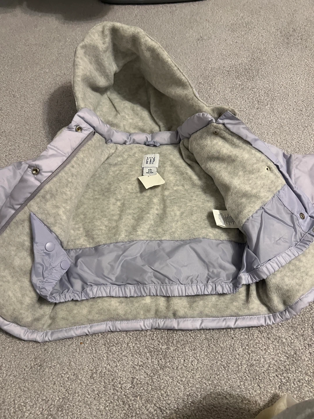 Selling a Baby Gap puffer jacket in size 3-6 months. It's a light purple colour and brand new. Perfect for keeping your little one warm!