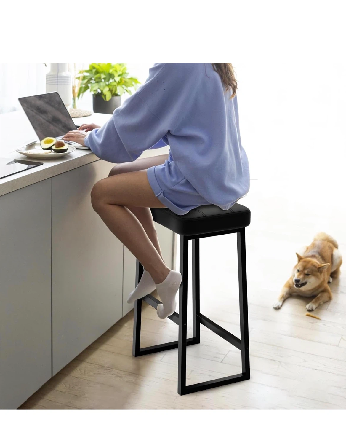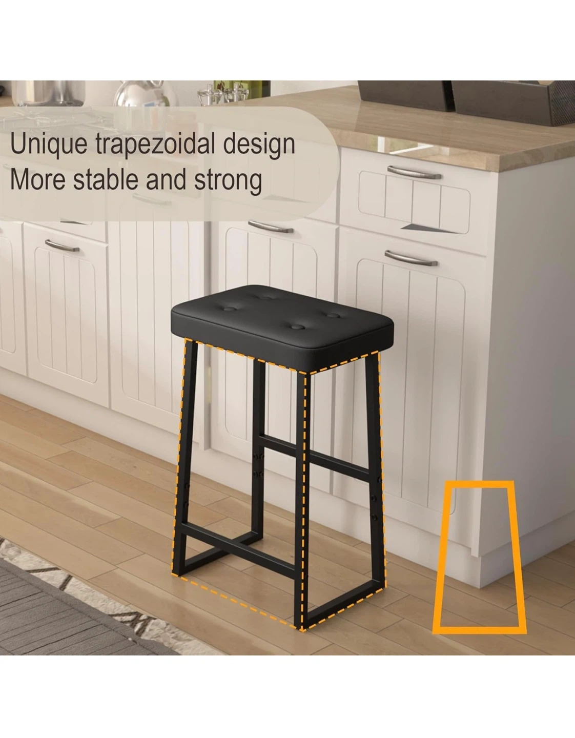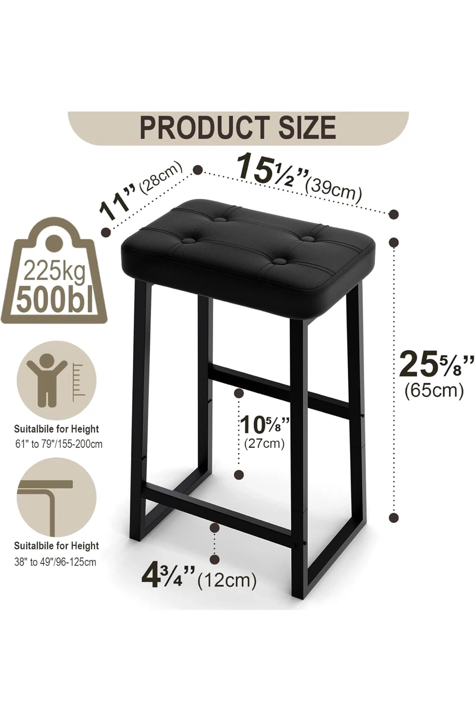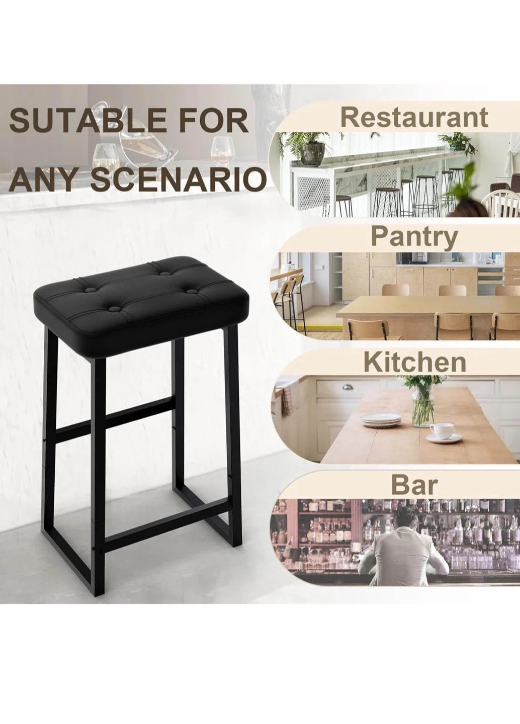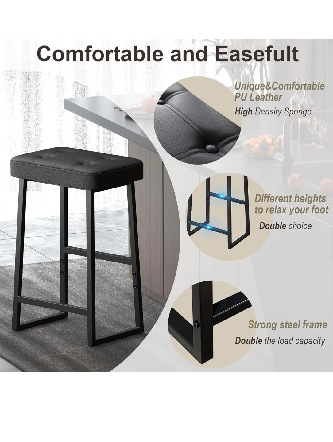 This black bar stool is perfect for your kitchen island or bar area! It features a comfortable PU leather seat with a high-density sponge for a cozy feel. The strong steel frame can handle a lot, and the different height options for your feet are a nice touch.