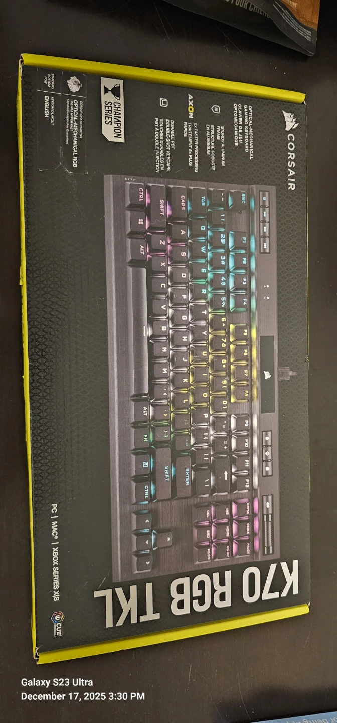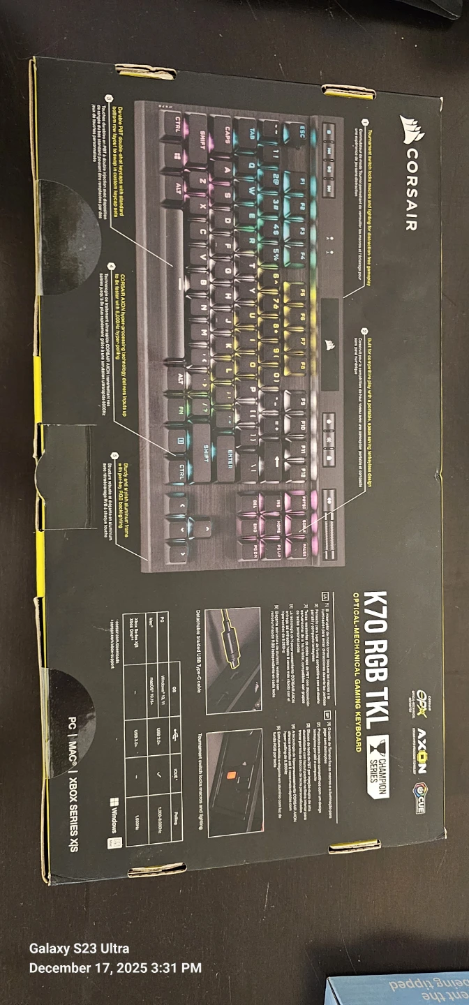 Selling a Corsair K70 RGB TKL mechanical gaming keyboard. It has standard double-shot PBT keycaps with a standard bottom row layout, making it easy to swap in custom keycap sets. It also features a detachable braided USB Type-C cable. Comes in sealed box