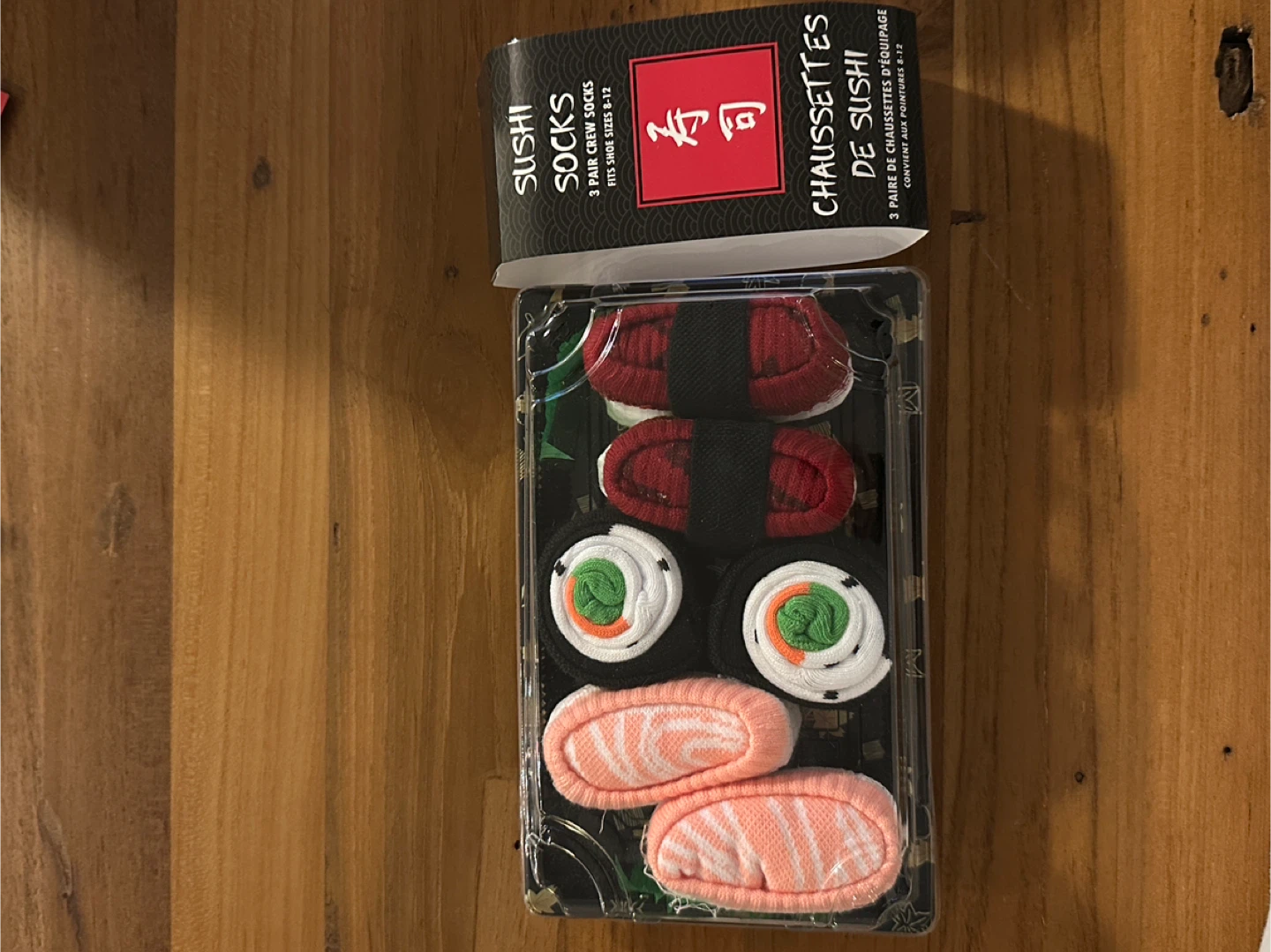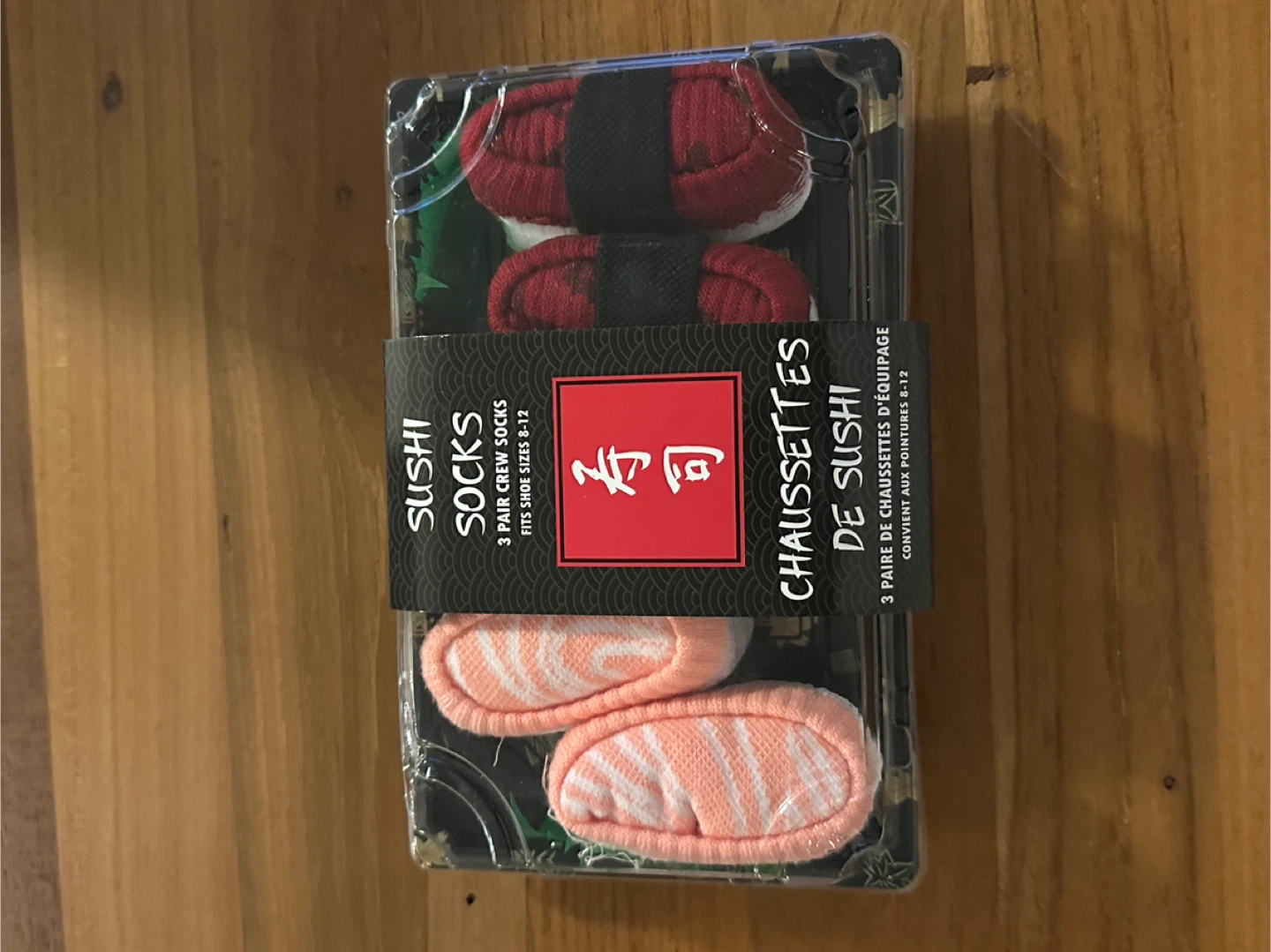 Here's a fun set of sushi socks! This package contains 3 pairs of crew socks. They fit shoe sizes 8-12.
