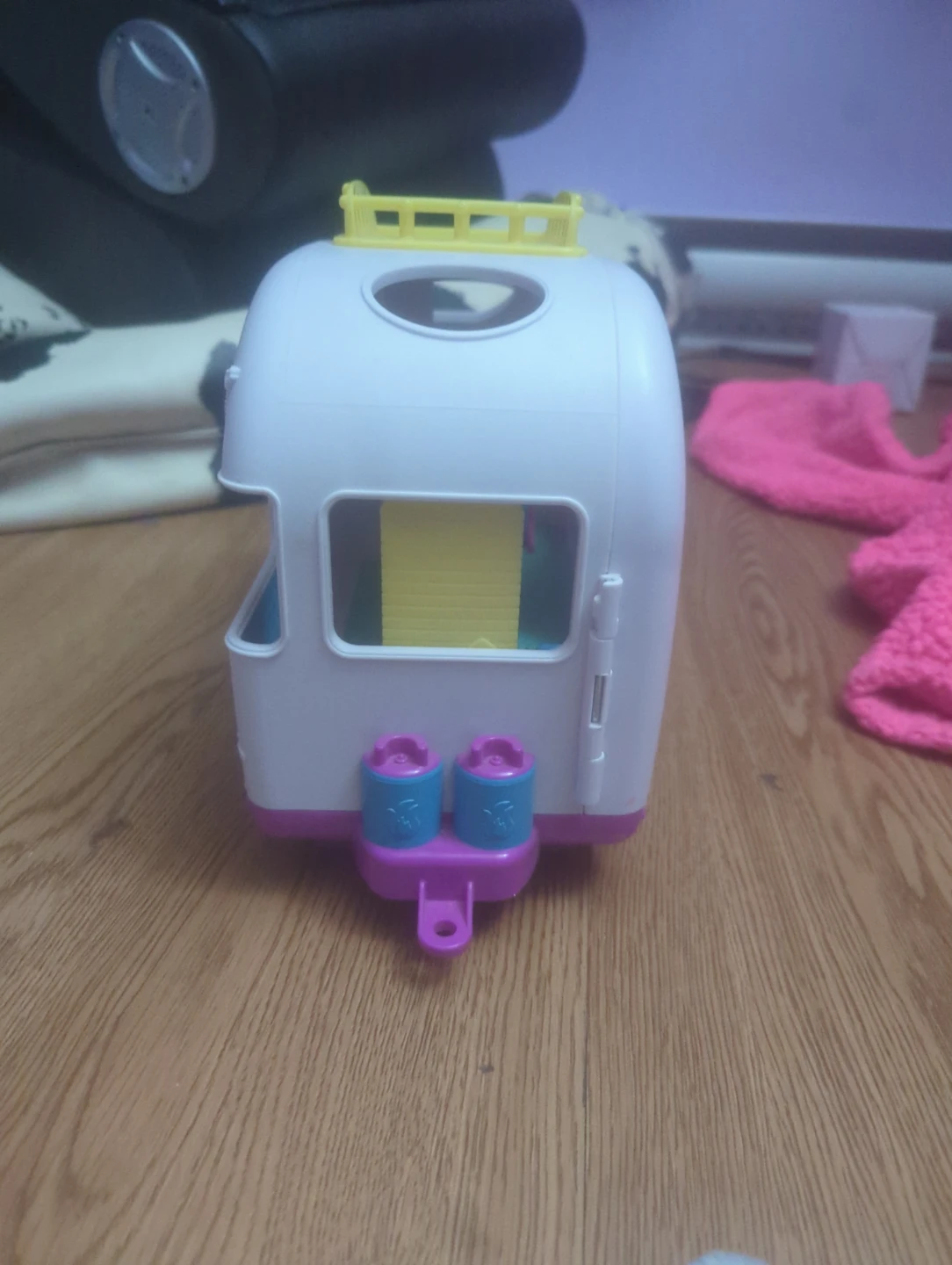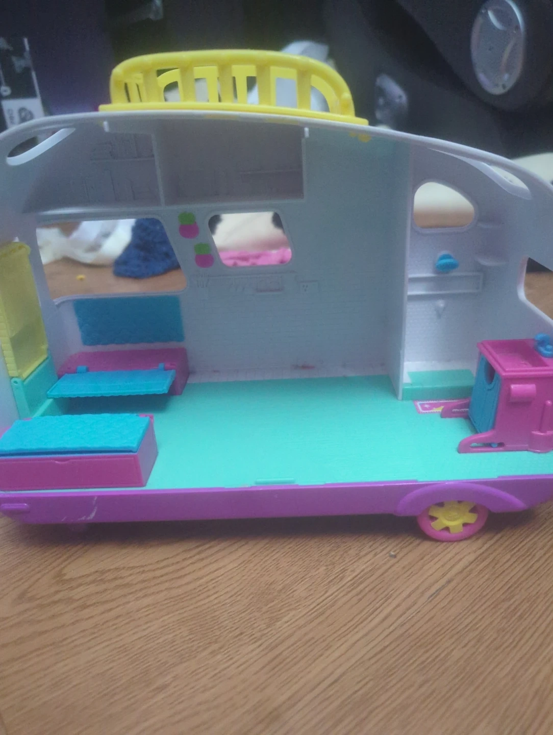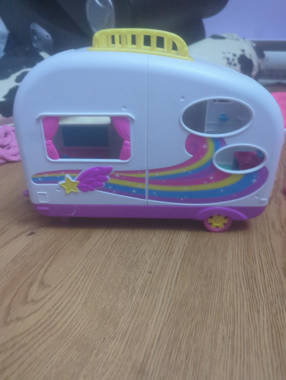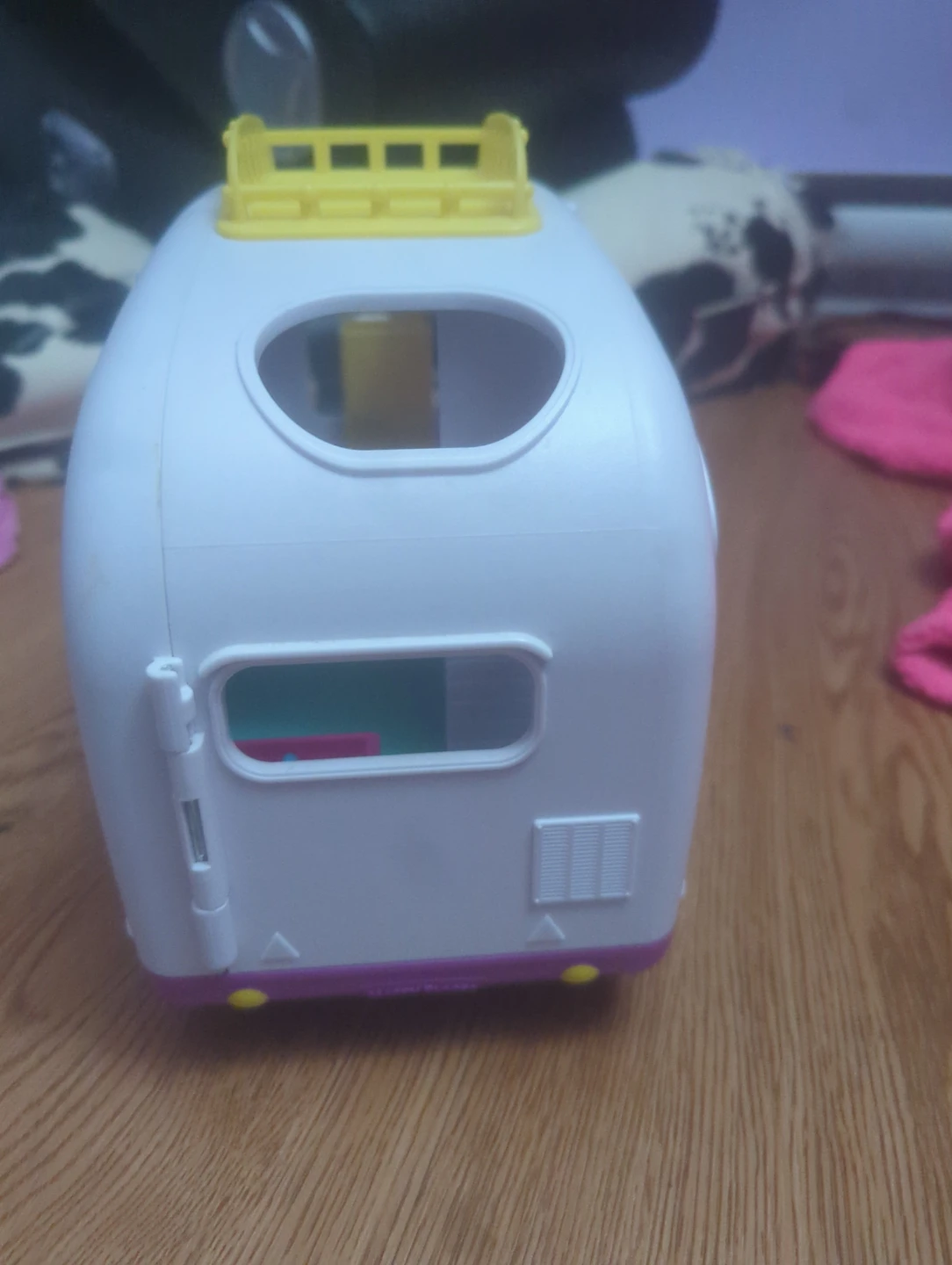 Shopkins camper van in great condition! It's white with pink and rainbow details, and a yellow roof rack. Perfect for your little one's Shopkins adventures