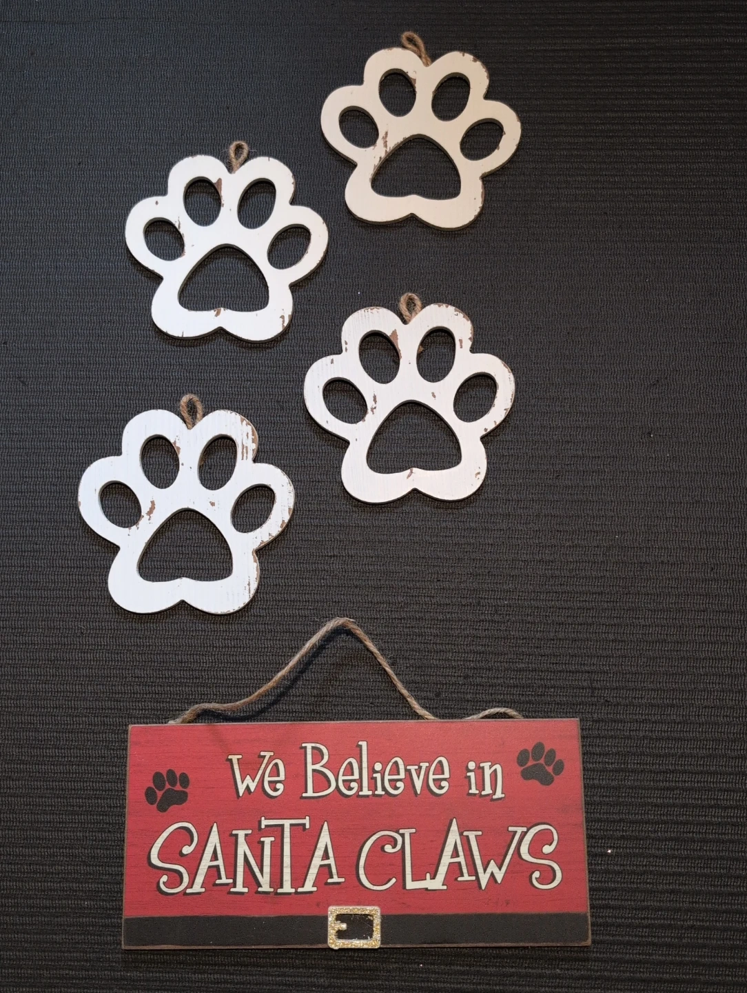 Get ready for the holidays with these cute decorations! There's a sign that says "We Believe in Santa Claws" (10"x4.75") and four paw print ornaments (5" diameter) Perfect for any pet parents home to add a festive touch!