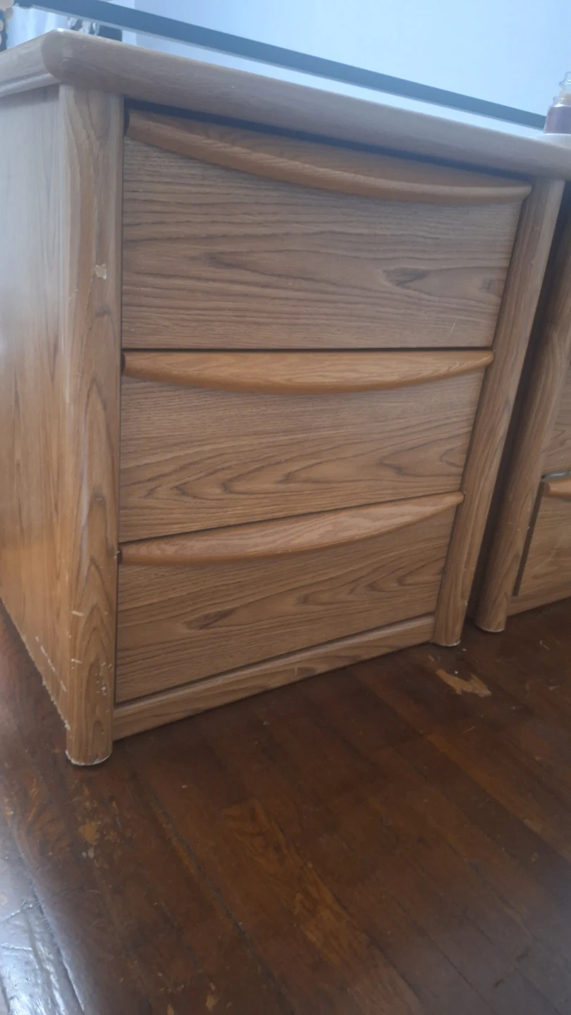 Selling a two wooden bedside table with three drawers. It's perfect for storing your nighttime essentials right next to your bed. This sturdy piece of furniture adds a touch of warmth to any bedroom!