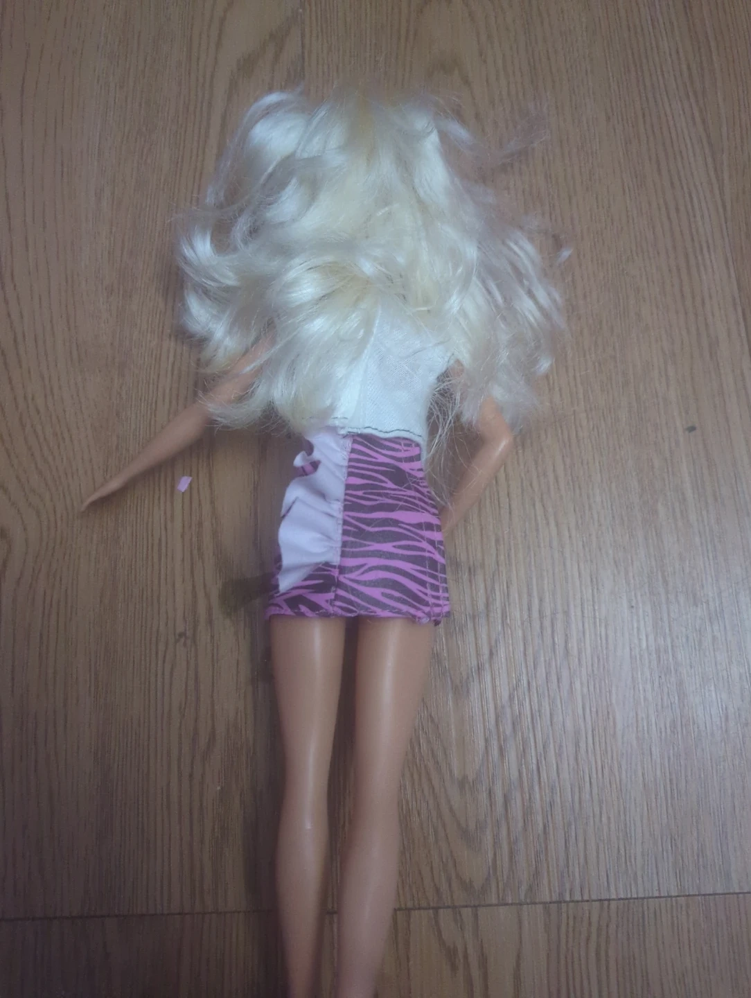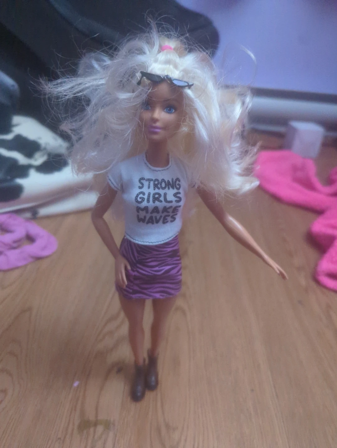 Selling a Barbie doll with a white shirt that says 'STRONG GIRLS MAKE WAVES' and a pink and black zebra-striped skirt! She's also wearing black boots and has blonde hair. Great for kids who love playing with dolls