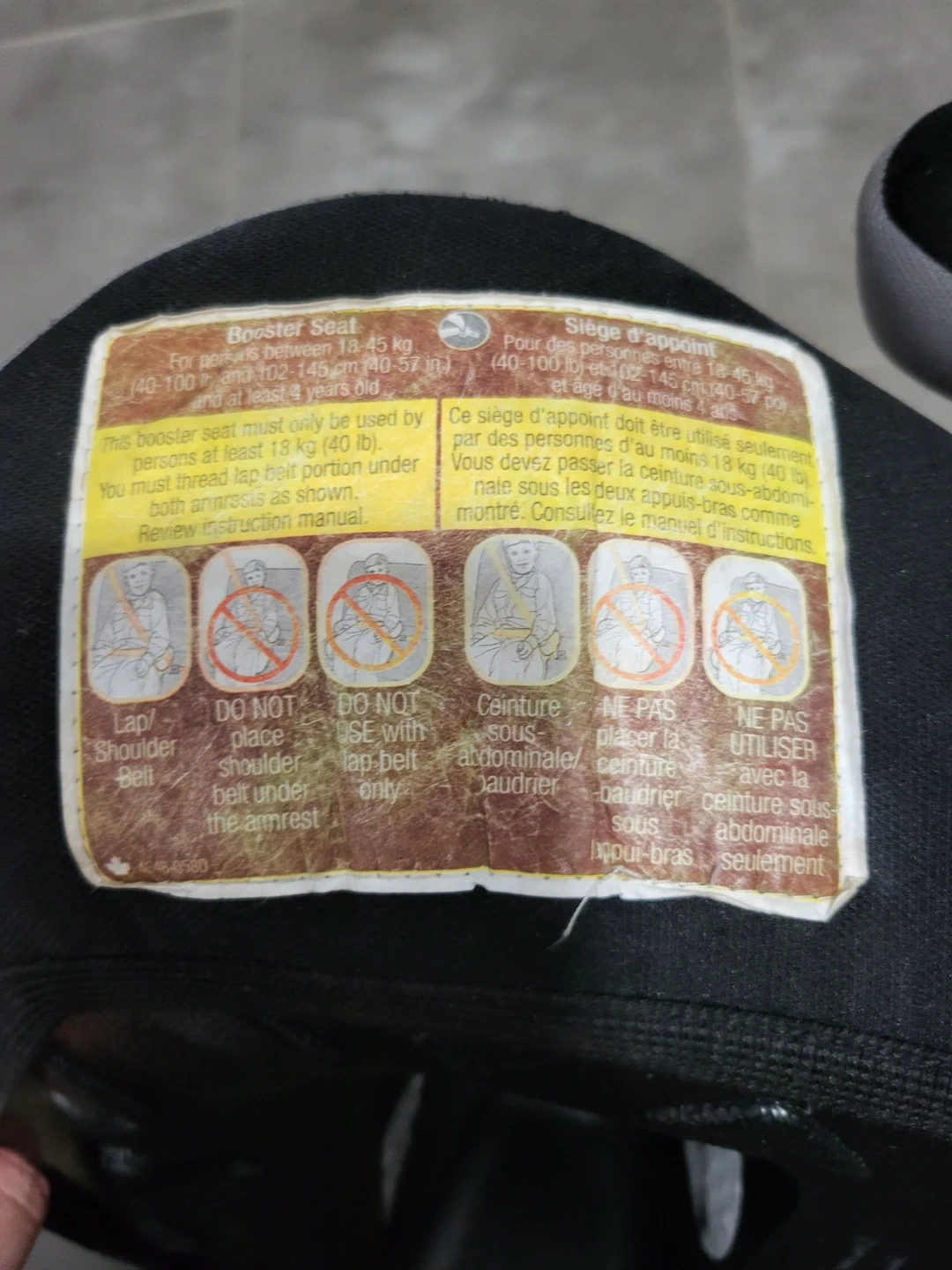 Selling a Cosco booster seat in great condition! It's designed for children between 18-45 kg (40-100 lb) and 102-145 cm (40-57 in), and at least 3 years old. This booster seat must only be used by persons at least 18 kg (40 lb).