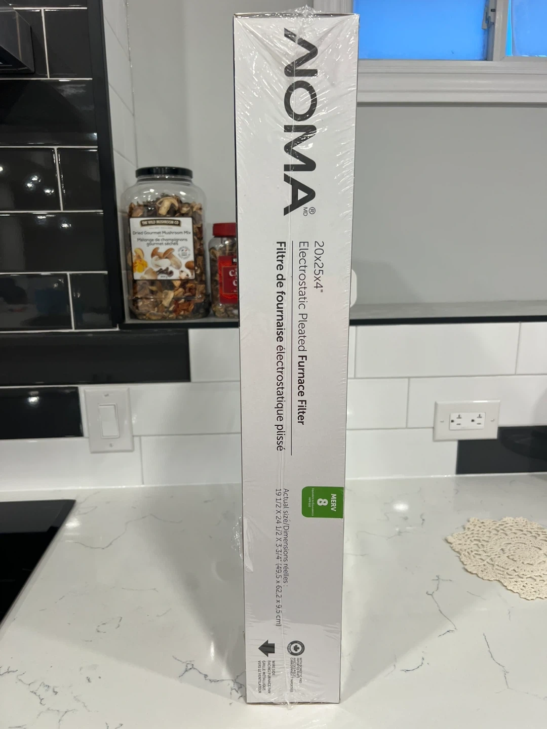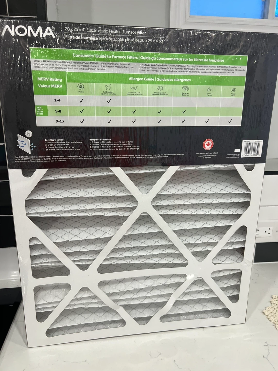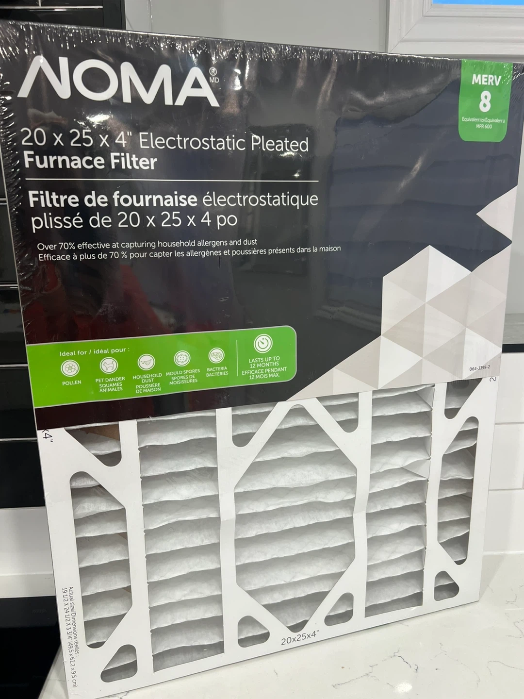 I'm selling a brand new NOMA 20x25x4" electrostatic pleated furnace filter. It's designed to filter household allergens and dust. Over 70% effective at capturing household allergens and dust